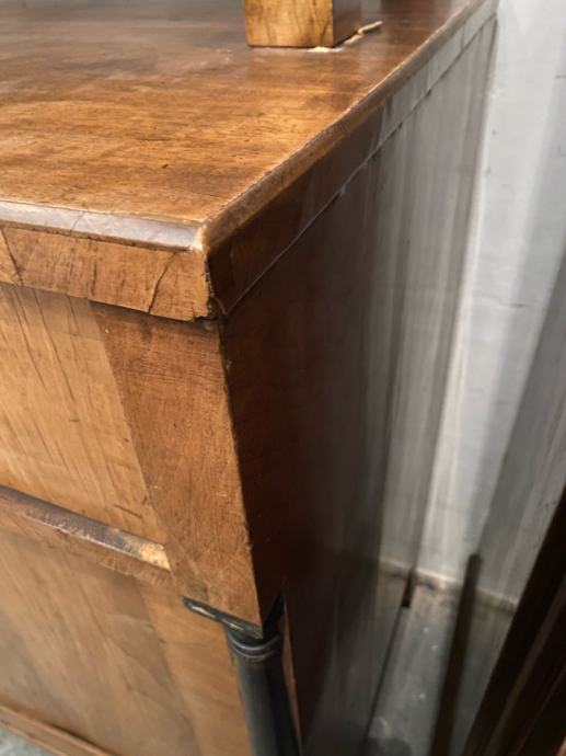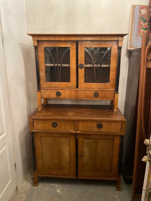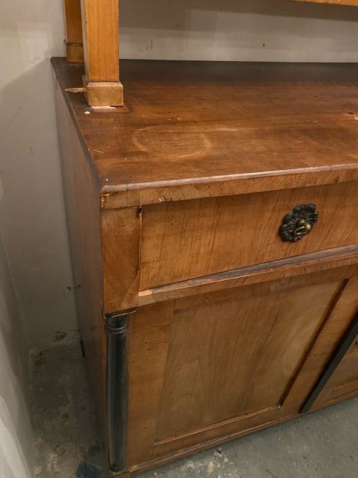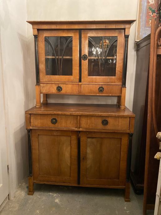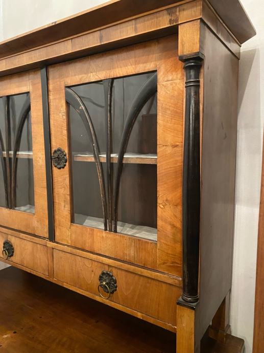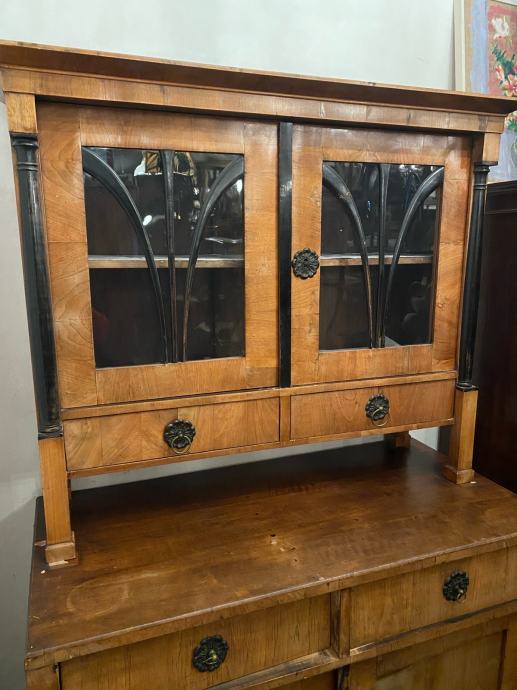 Bidermajer kredenac u vrlo dobrom stanju, furniran debelim orahovim furnirom sa crnim stupovima i detaljima.