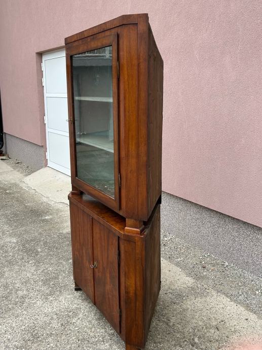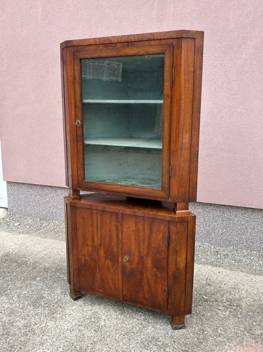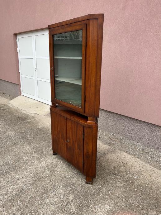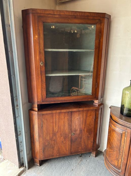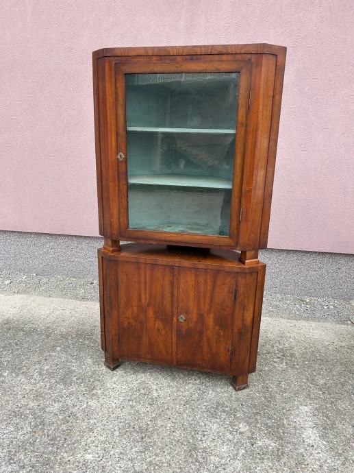 Krasna kutna vitrina iz razdoblja bidermajer, napravljena je u prvoj polovici 19og stoljeca.