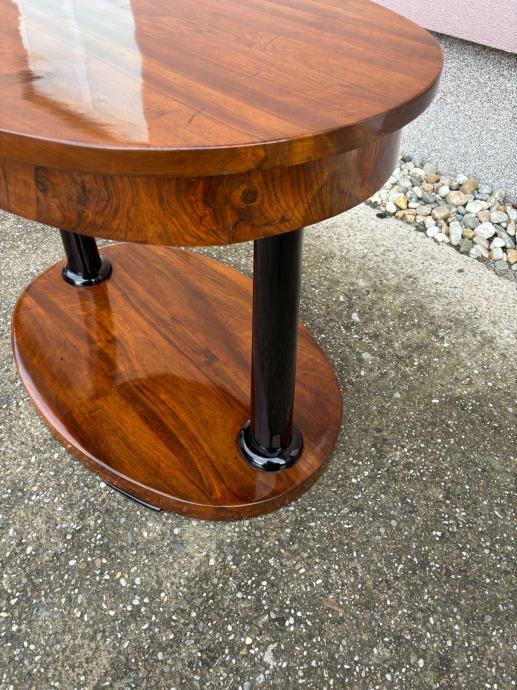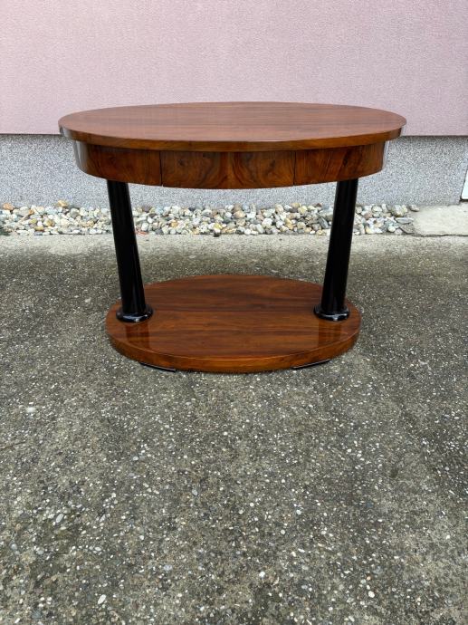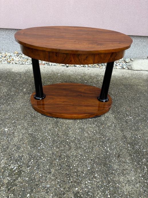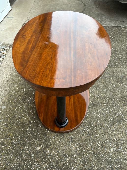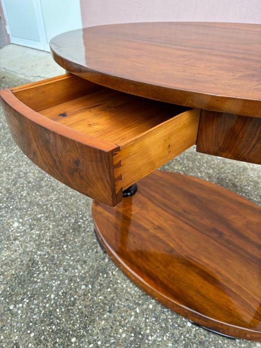 Kompletno restaurirani i šelakom politirani bidermajer stol iz vremena. Stol je napravljen od masiva oraha te djelomicno furniran istim.