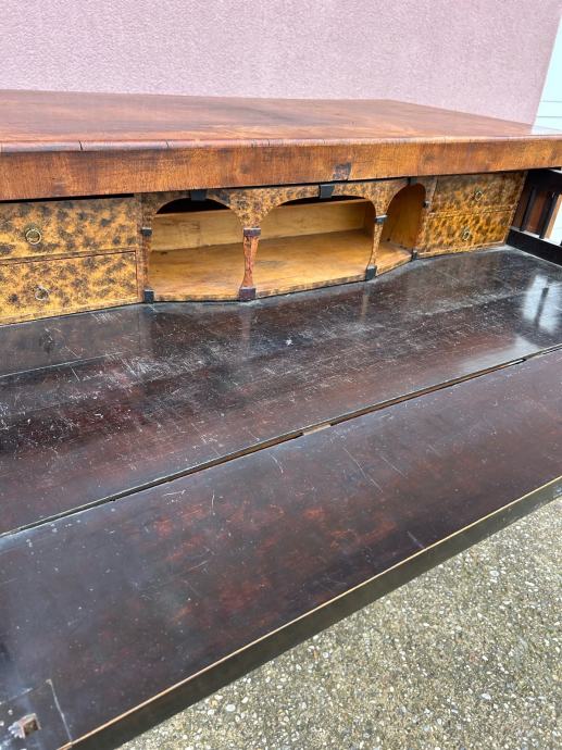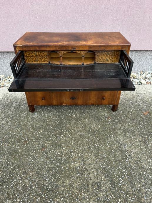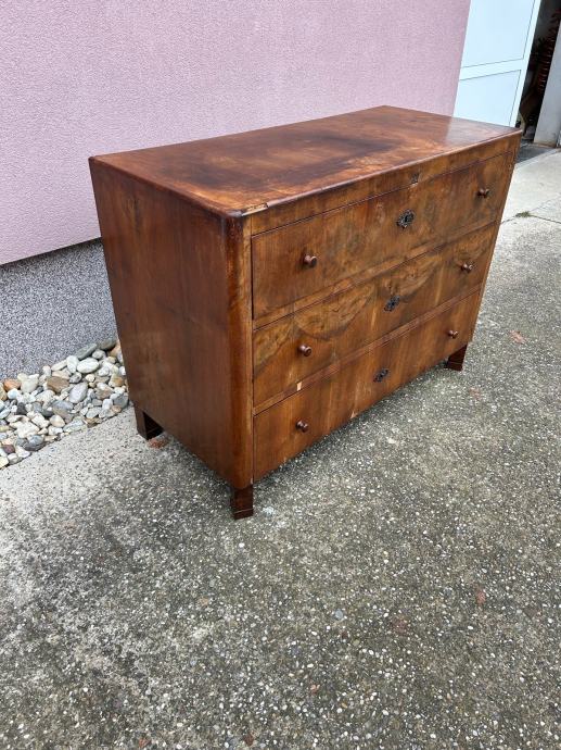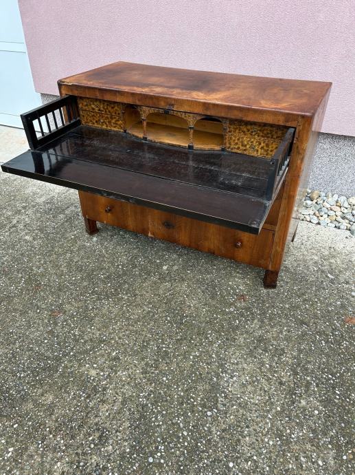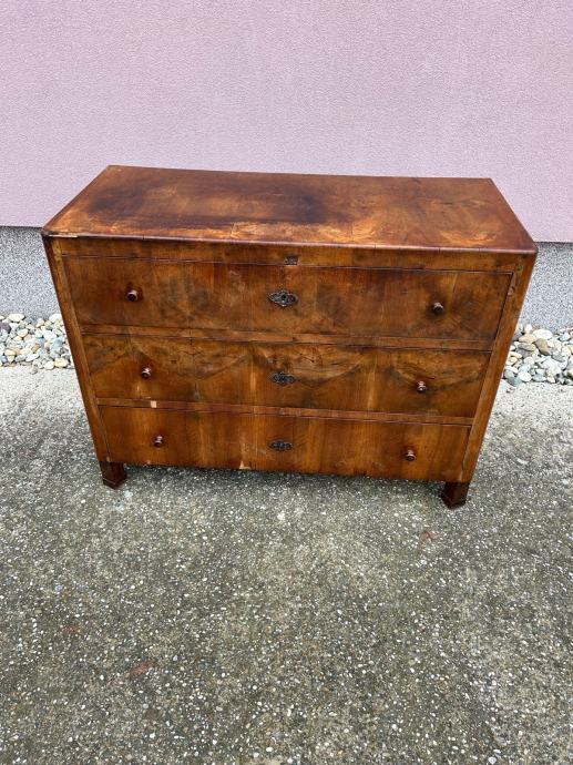 Bidermajer pisaca komoda, napravljena u prvoj polovici 19stoljeca. Komoda je furnirana debljim orahovim furnirom i u dobrom je stanju.