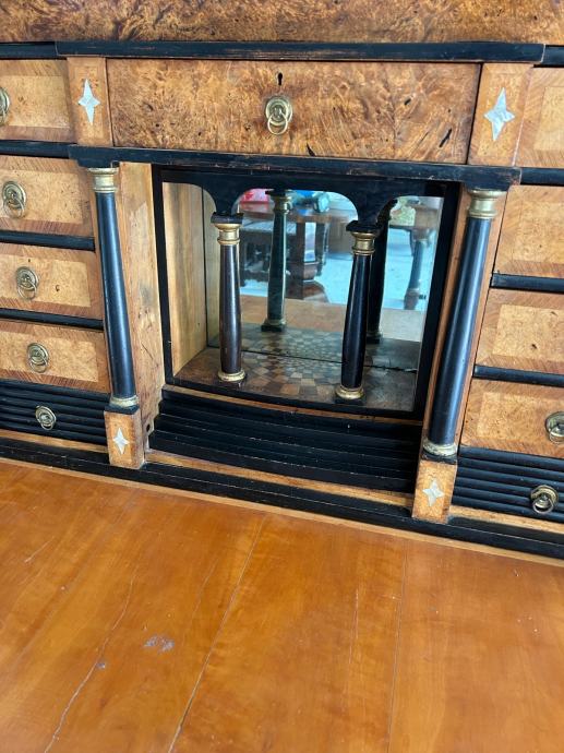 Bidermajer sekreter iz vremena sa prekrasnim tokarijama, rezbarijama i intarzijama.