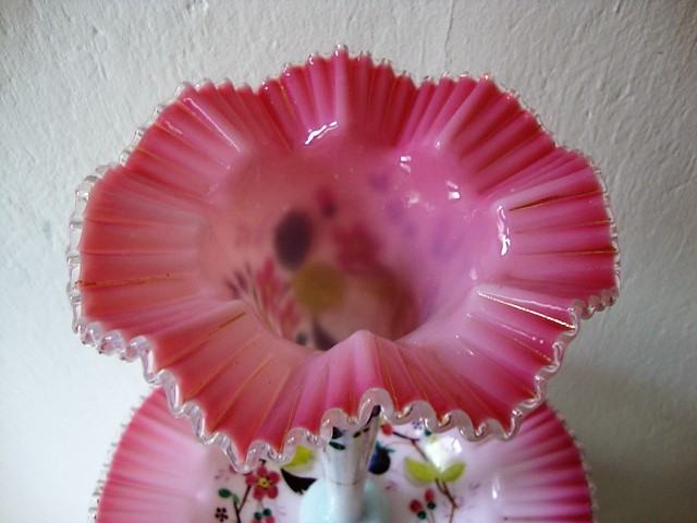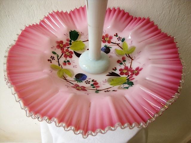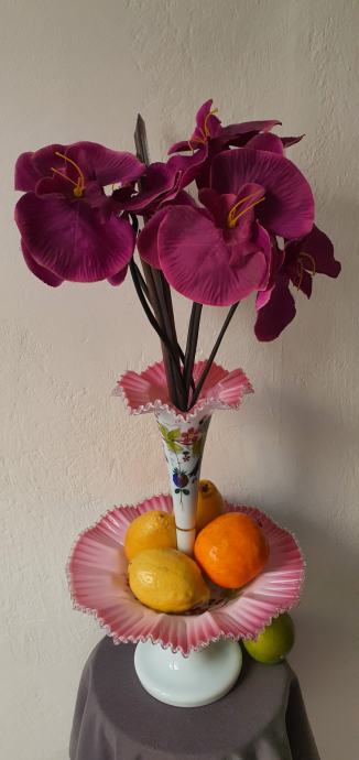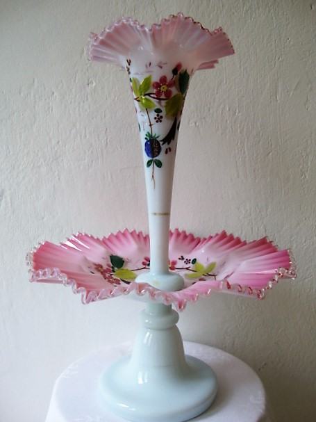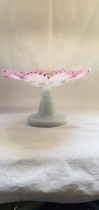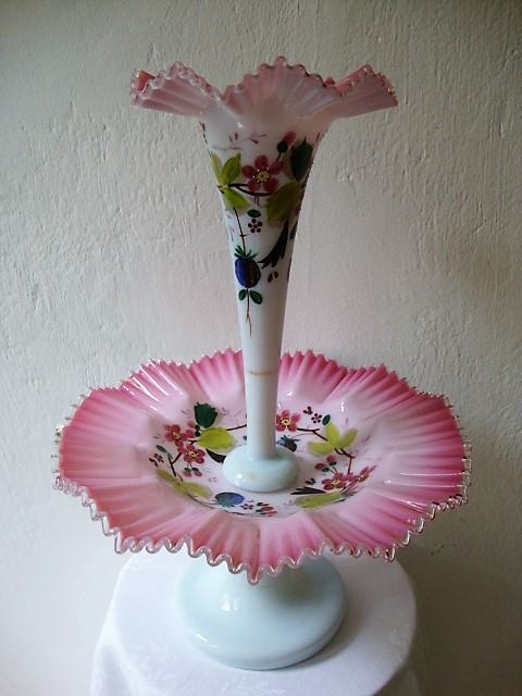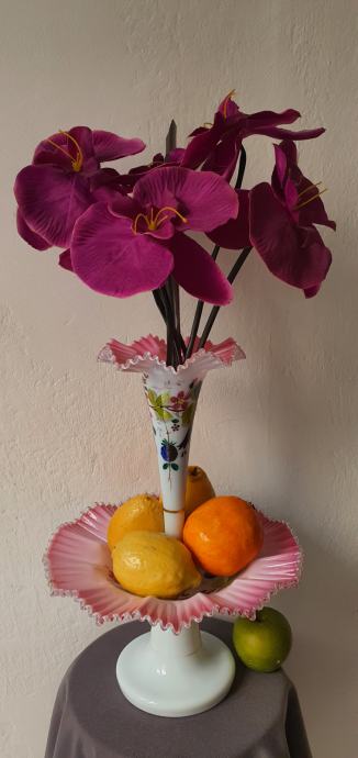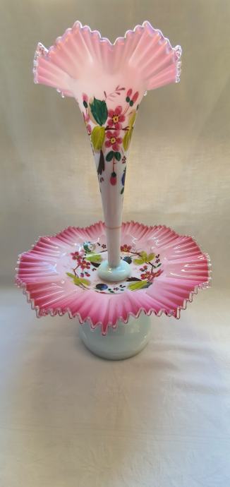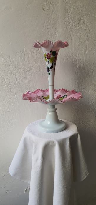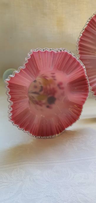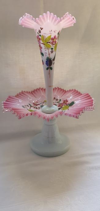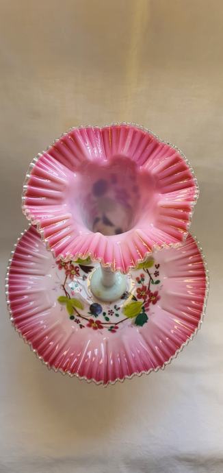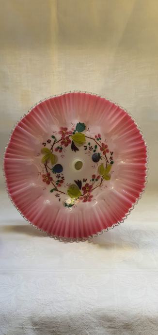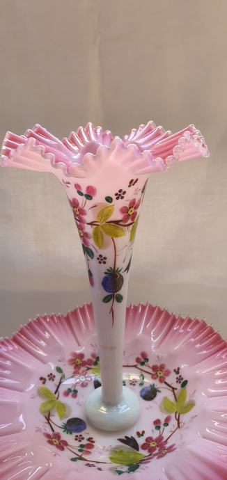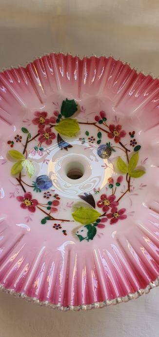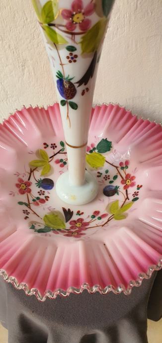 Predivan bidermajer na secesiju u savršenom stanju ručno oslikan emaj cvijetići pozlata ricasto rubno staklo kombinacija bijelo mliječno i roza