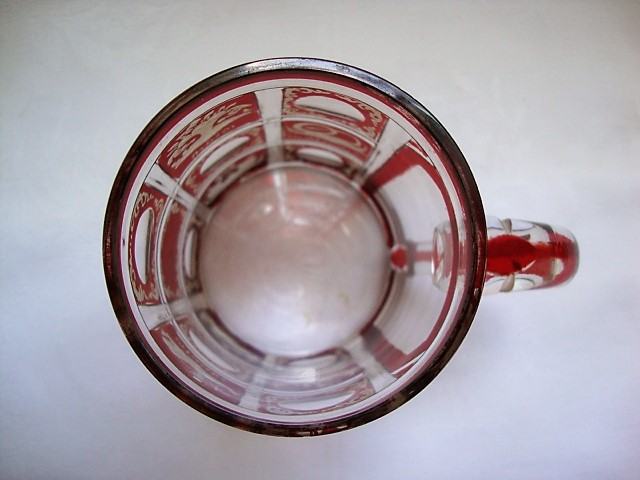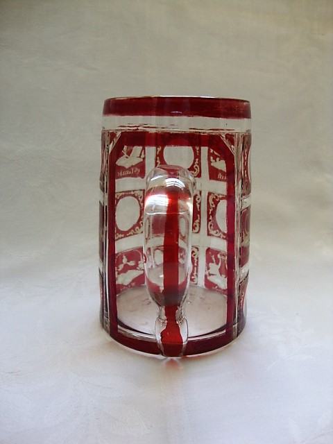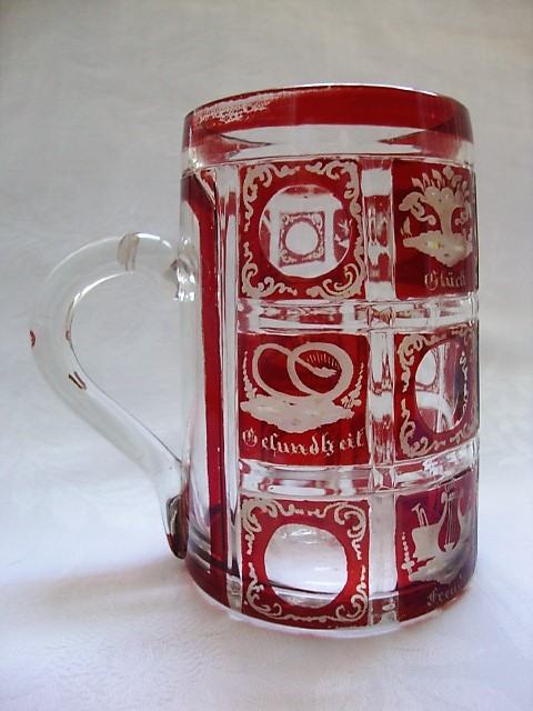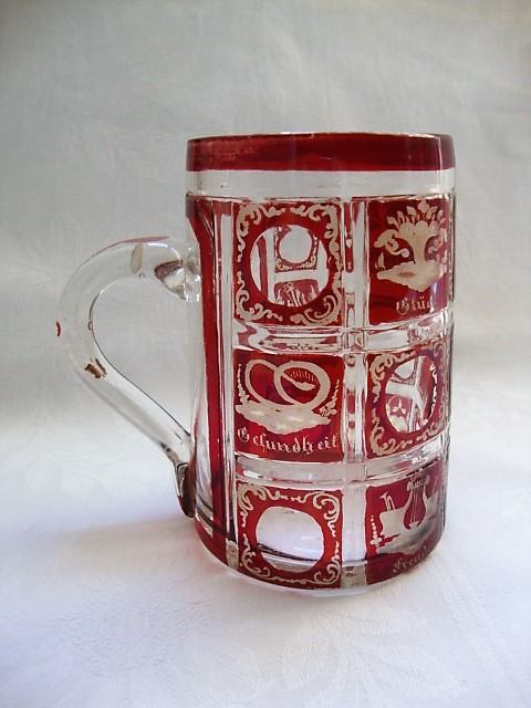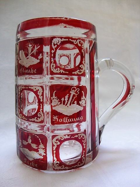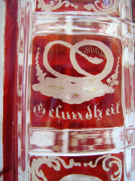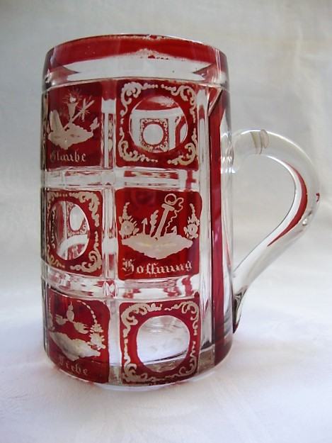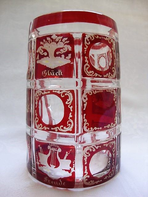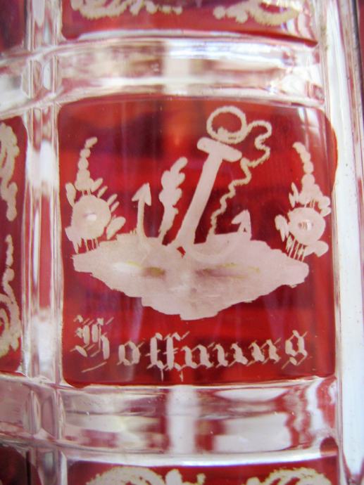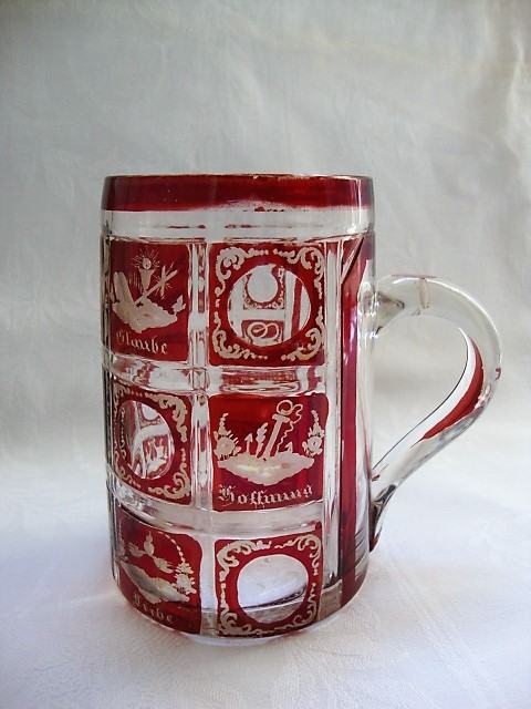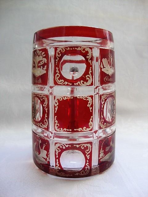Predivna bidermajer rubin čaša sa drškom njemačka ručno gravirana i brušena sa 15 kockastih ukrašenih polja sa različitim motivima (Ljubav,Sreća,Prijatelji,...)