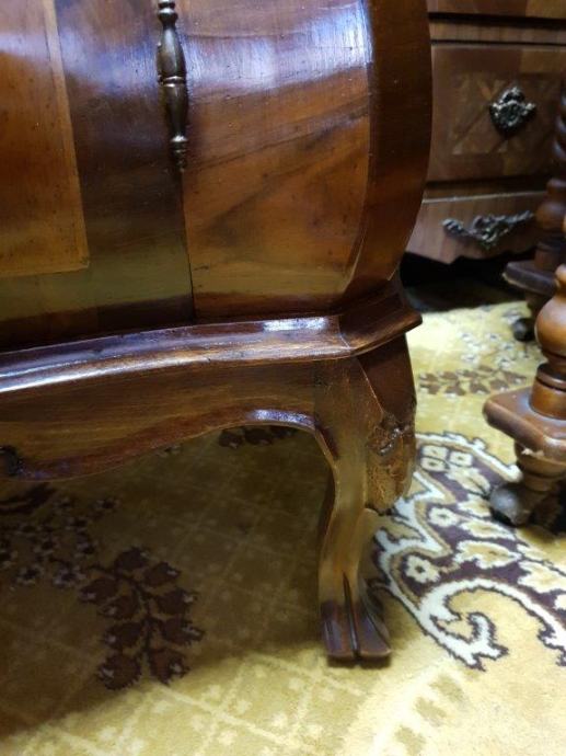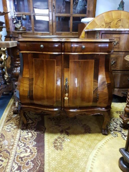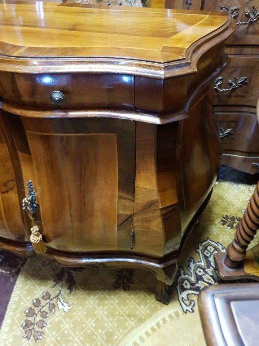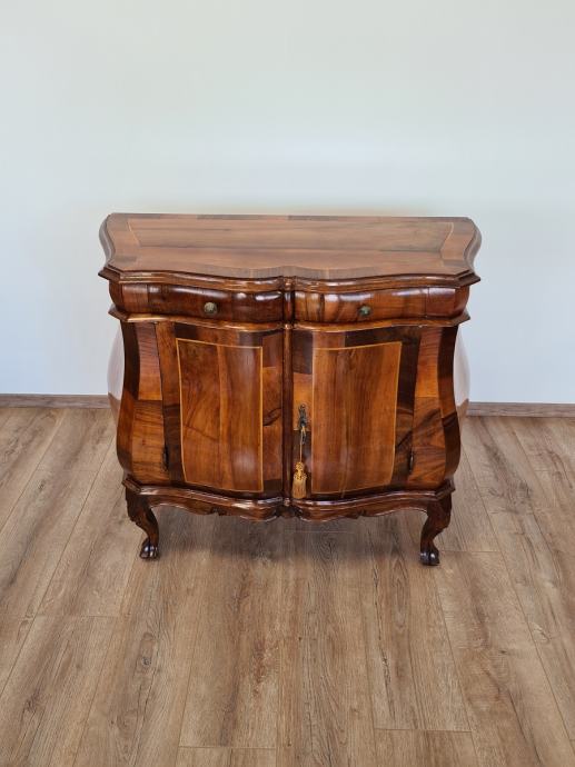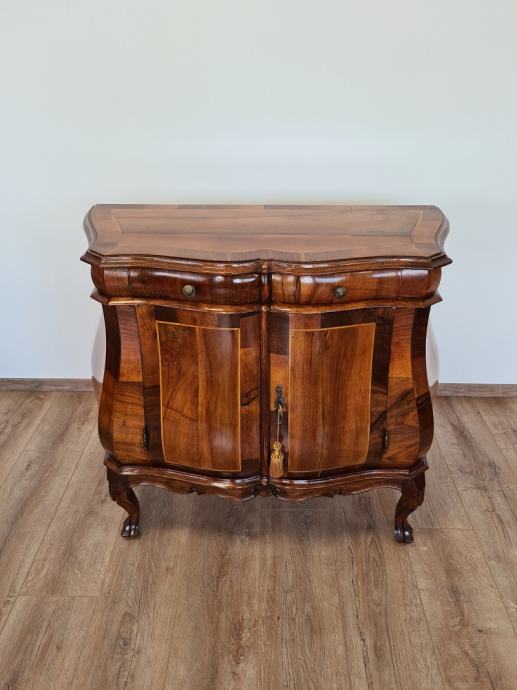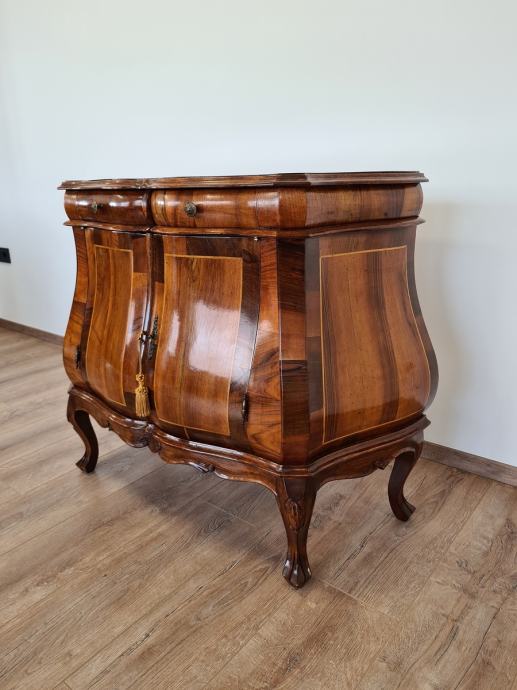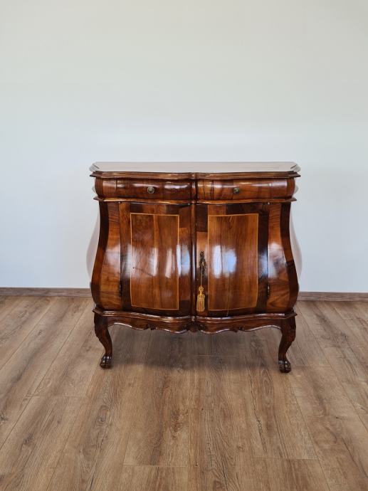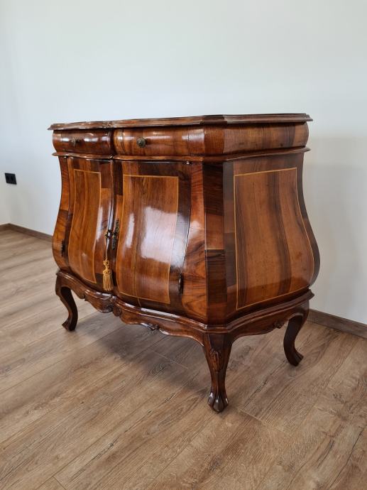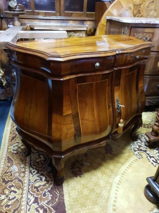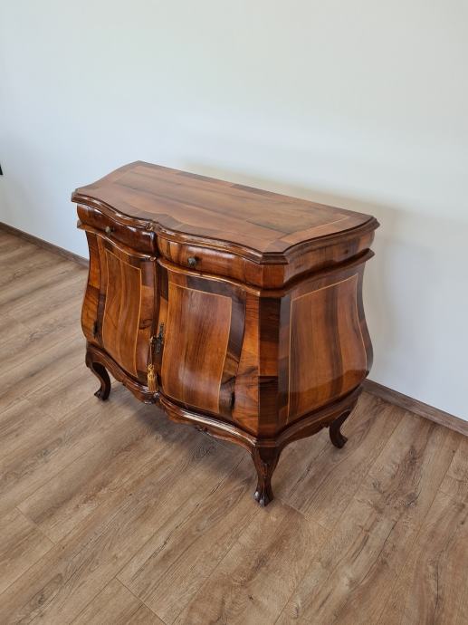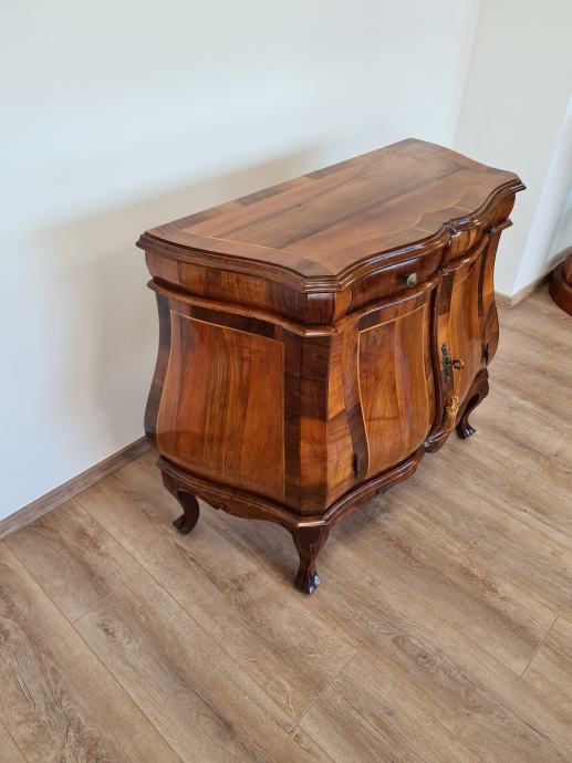 Bombirana masivna komoda, restaurirana, rađena od punog drveta, vidljivo sa slika.