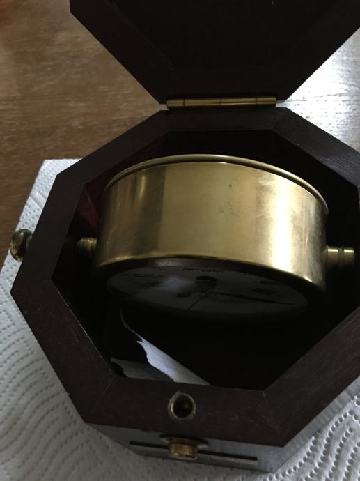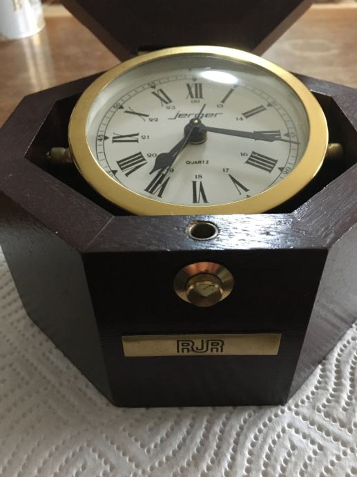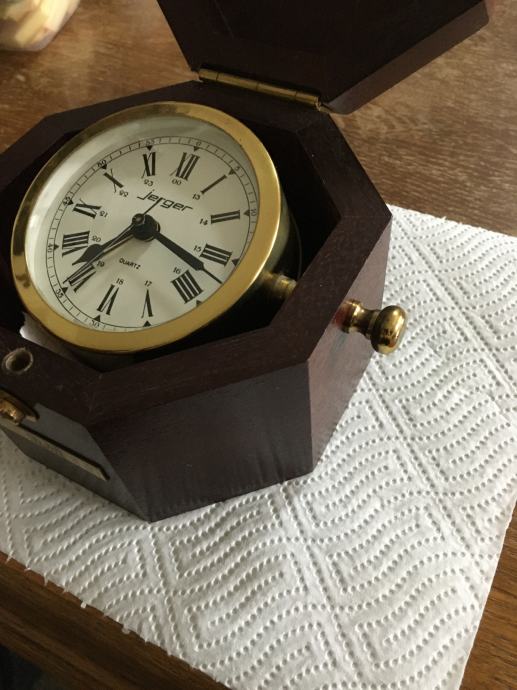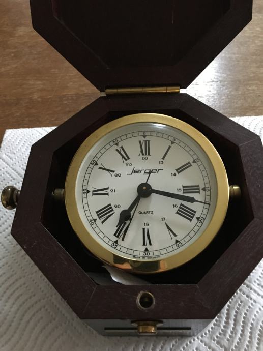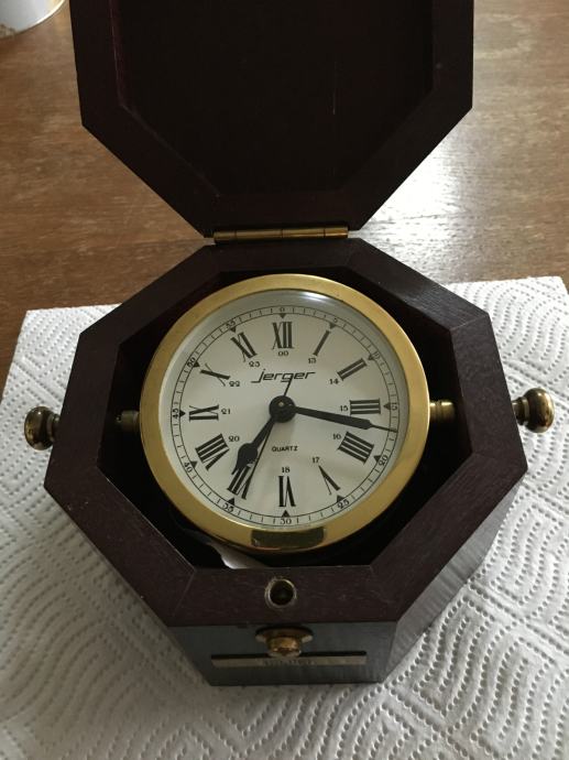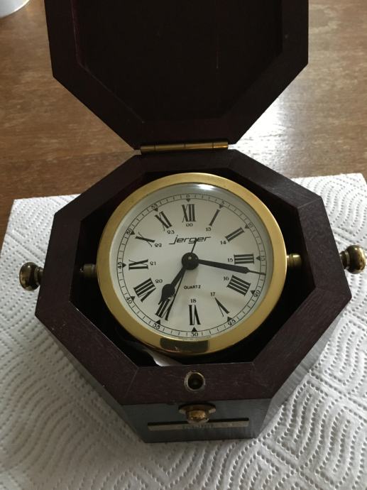 Brodski sat u drvenom kućištu,može služiti i kao komodni sat,ispravan komplet super stanje,radi na bateriju,visina kućišta10cm-širina --14cm
