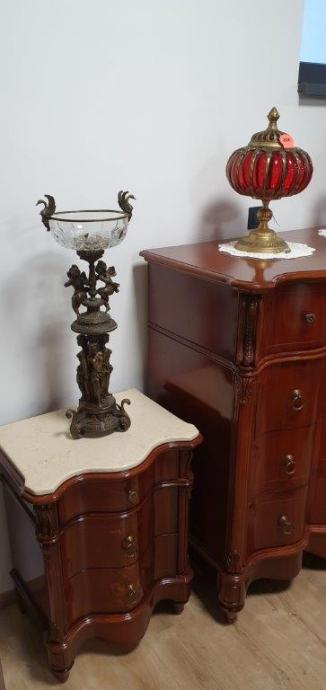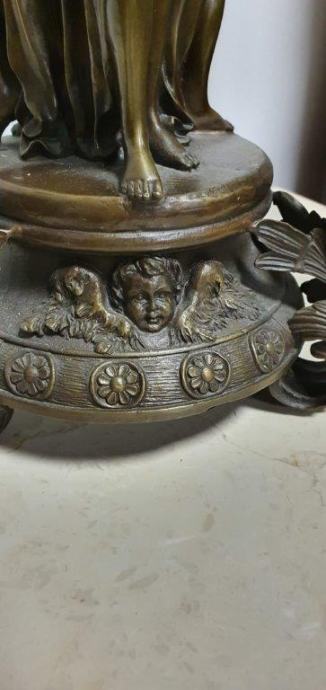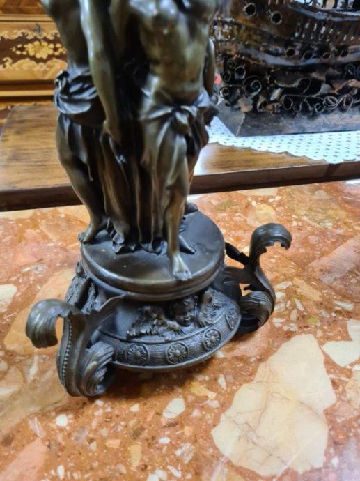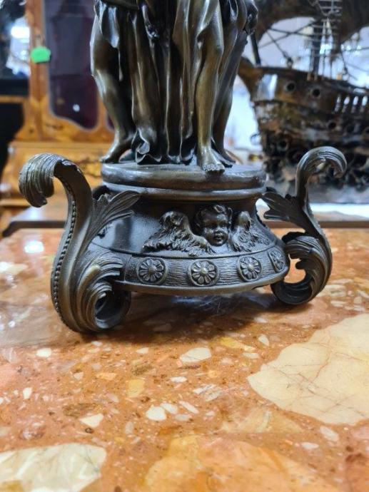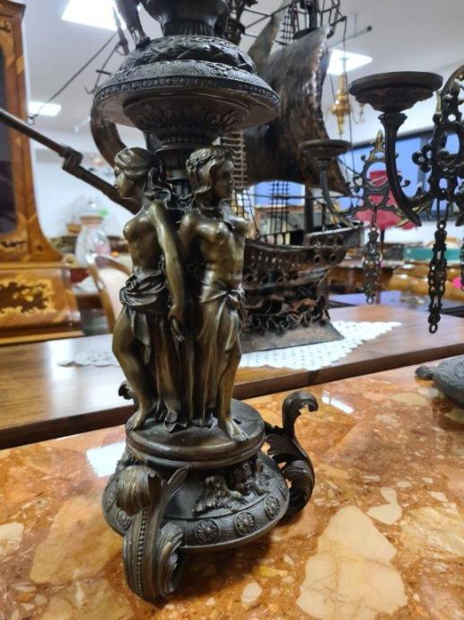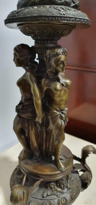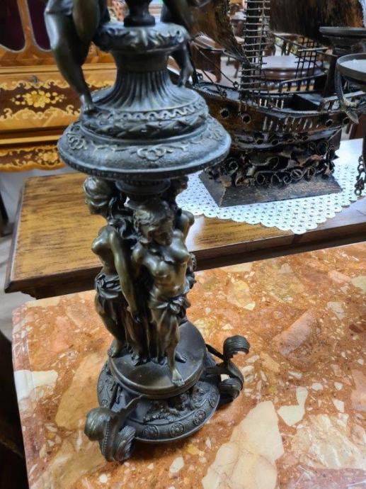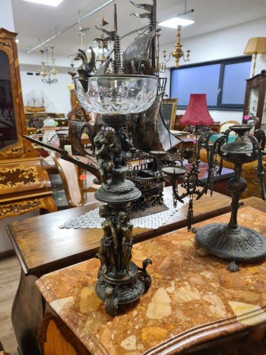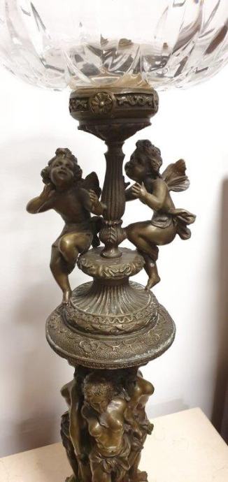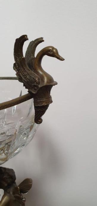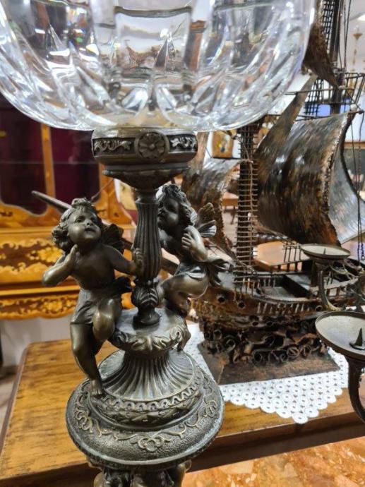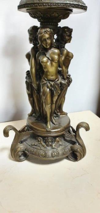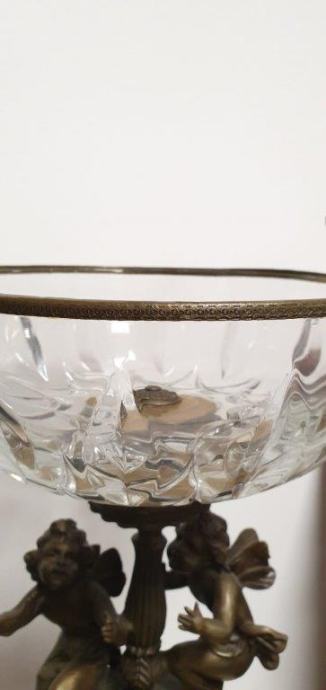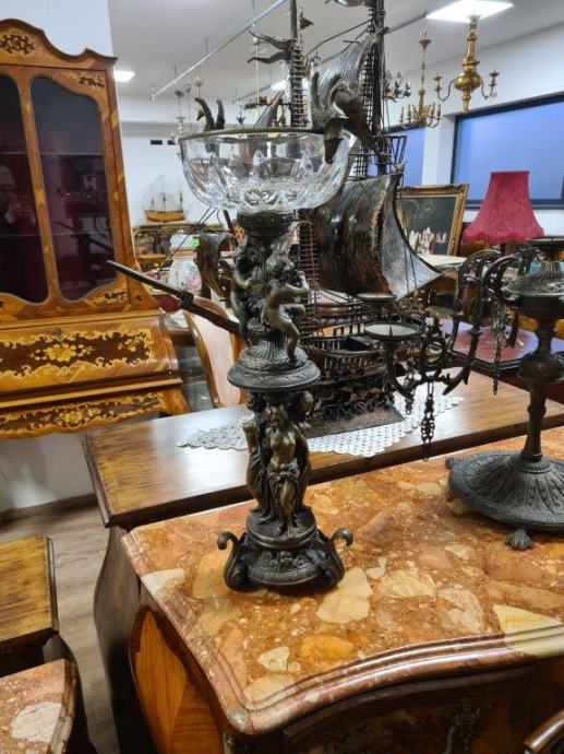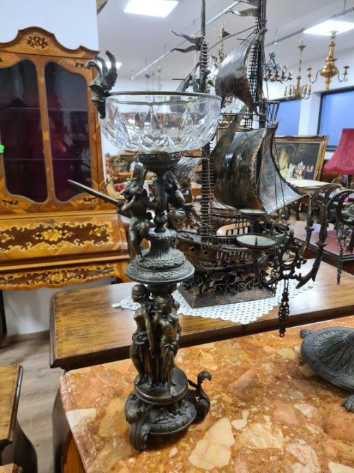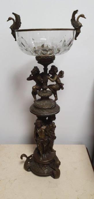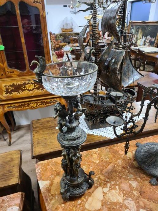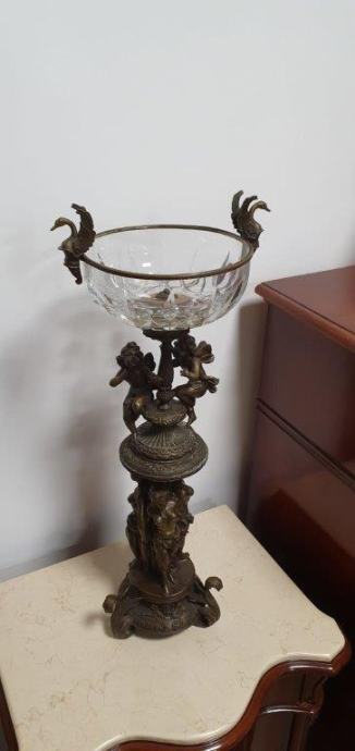 Jedinstvena brončana zdjela za slatkiše, jedinstveni ručni rad, masivna i teška. Impresivan komad. Dimenzije promjer 21 cm, ukupna visina 69 cm.