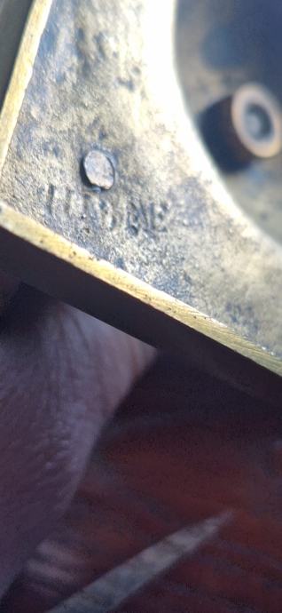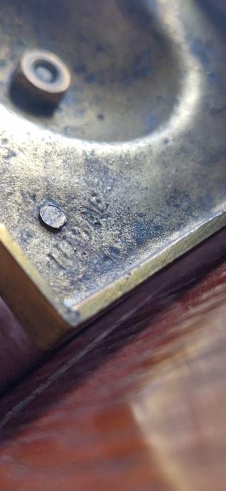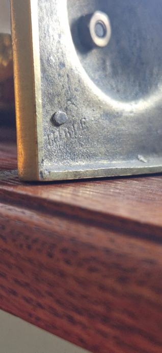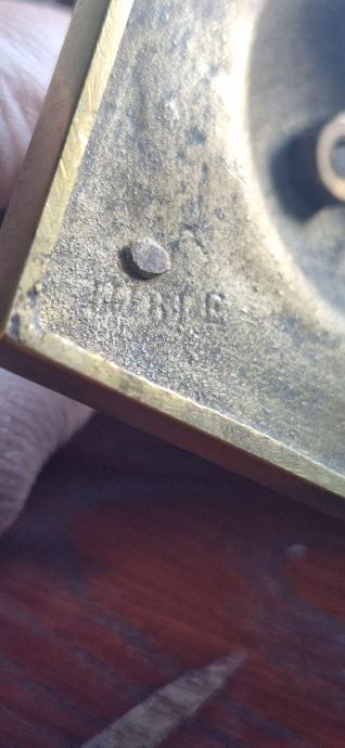 Na dnu baze nalazi se jasno vidljiv radionički žig/potpis majstora (vjerojatno francuska ili talijanska ljevaonica), što potvrđuje da je riječ o originalnom antikvitetu, a ne modernoj kopiji.