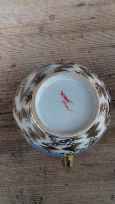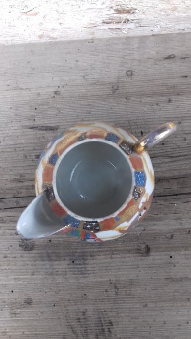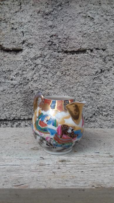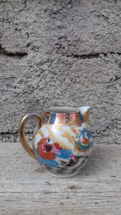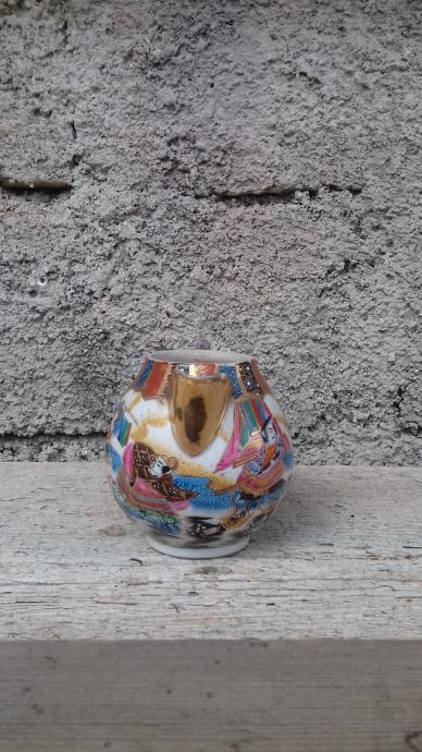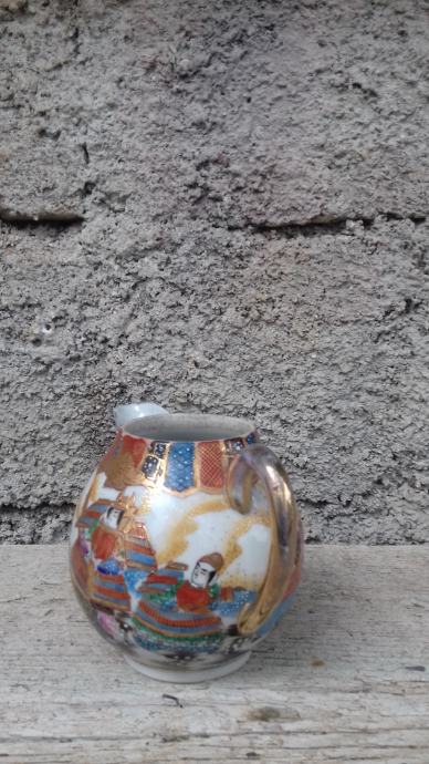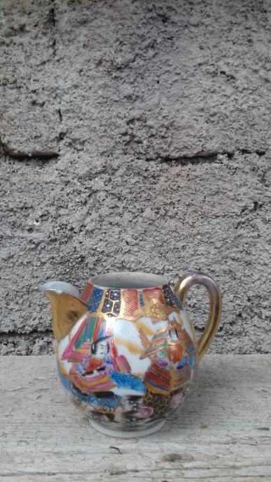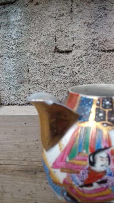 Prodaje se čajnik od porculana s motivima samuraja. Visina čajnika je cca 11 cm. Čajnik je bez pripadajućeg poklopca s malim oštećenjem na grlu za lijevanje i sa tragovima blijeđenja boje na rukohvatu (vidljivo na fotografijama) zbog čega se od strane prodavatelja čajnik prodaje kao neupotrebljiv, oštećen i isključivo kao dekoracija. Cijena čajnika je 20 eura. Mogućnost osobnog preuzimanja u Zadru. Kontakt broj mobitela: 091 131 10 36.