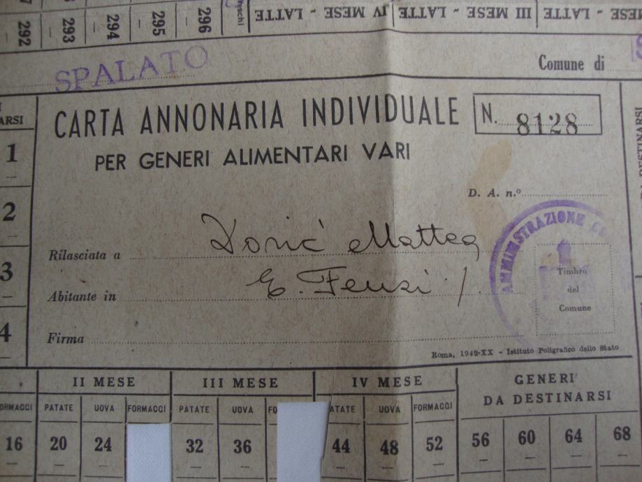 CARTA ANNONARIA INDIVIDUALE PER GENERI ALIMENTARI VARI 1942.XX./3 KOM