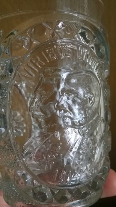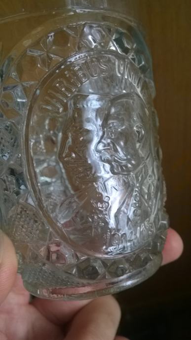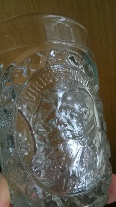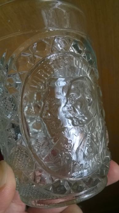 Vidljivo je da je čaša kristalna, rađena serijski na kalup ,te još dodatno ručno obrađivana, Na prednjoj strani su Franz Josef i Kaiser Wilhelm II. (Za ovog drugog nisam siguran da li je - mislim da je). Ispod njih piše godina 1914/15
