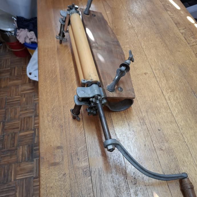 Uređaj sadrži drveni valjak montiran na metalni okvir s vijcima za zatezanje.