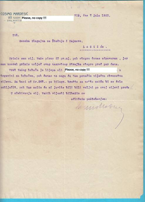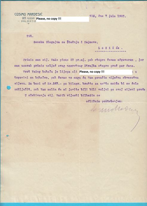 COSIMO MARDEŠIĆ (Otok Vis - Lissa) stari dopis iz 1923. KUPNJA BUHAČA
