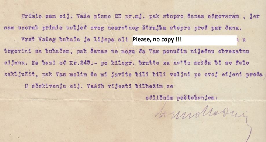 Vrlo zanimljivi stari dopis iz 1923. godine sa ponudom za kupnju Dalmatinskog buhača (cvijeće).