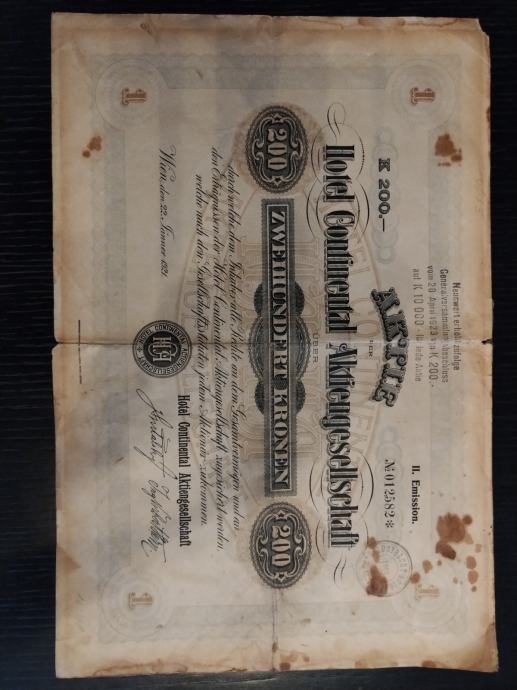 Prodajem staru dionicu hotela Continental iz Beča iz 1921 g. Uz nju idu još neki tiketi i par starih papirića je također tu. Sve skupa za 25 € ili po dogovoru. 095 33 84 216