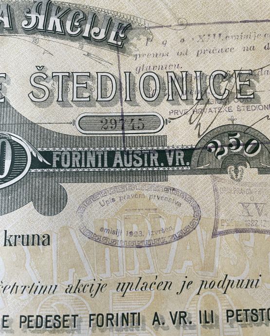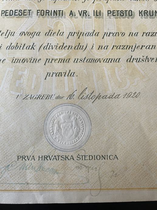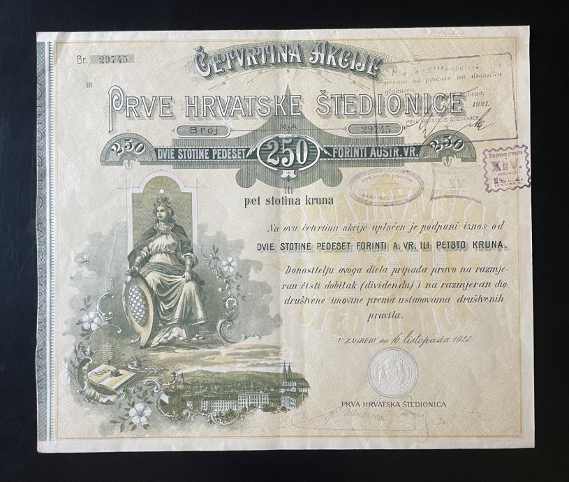 Zagreb, četvrtina akcije PRVE HRVATSKE ŠTEDIONICE 250 forinti ili 500 kruna, Zagreb, 16. listopada 1920. dimenzije: 37x31,5 cm