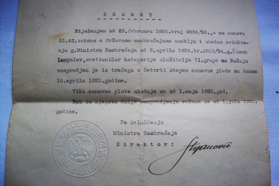 Sa potpisom ministra saobraćaja iz doba kraljevine 1925 godine očuvani dvolist