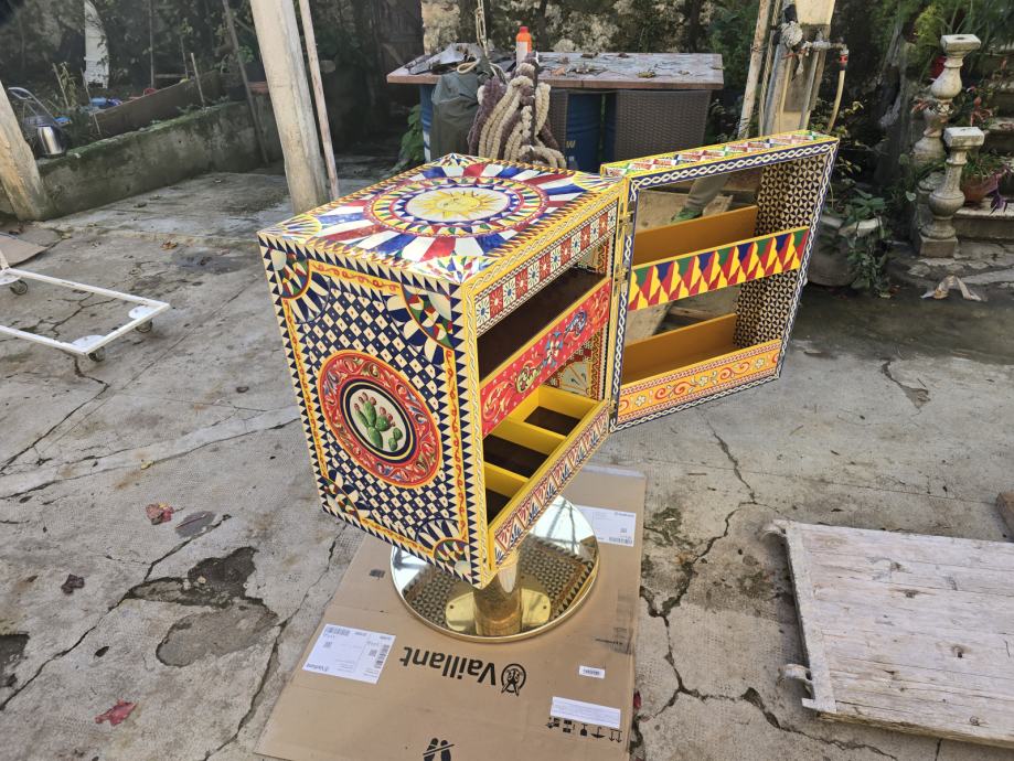 Komad je bogato dekoriran tradicionalnim sicilijanskim uzorcima (sunce, karretto, fico d’India, geometrijski motivi) s lakiranom zavrsnom obradom. Unutrašnjost sadrži više funkcionalnih ladica i pretinaca. Na komadu je vidljiv originalni potpis Dolce & Gabbana, što potvrđuje autentičnost.