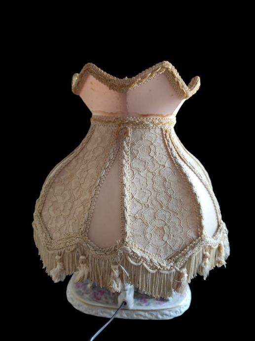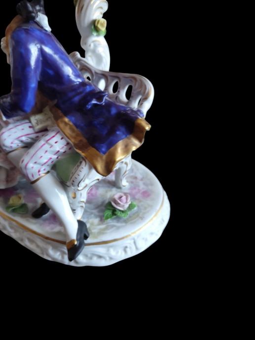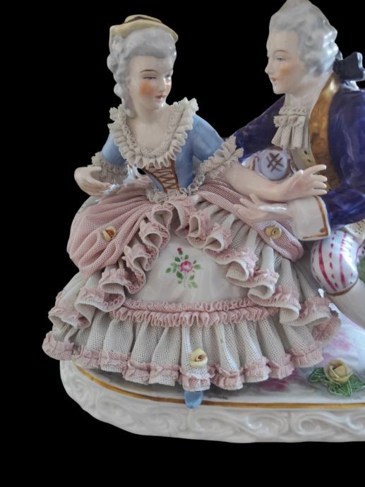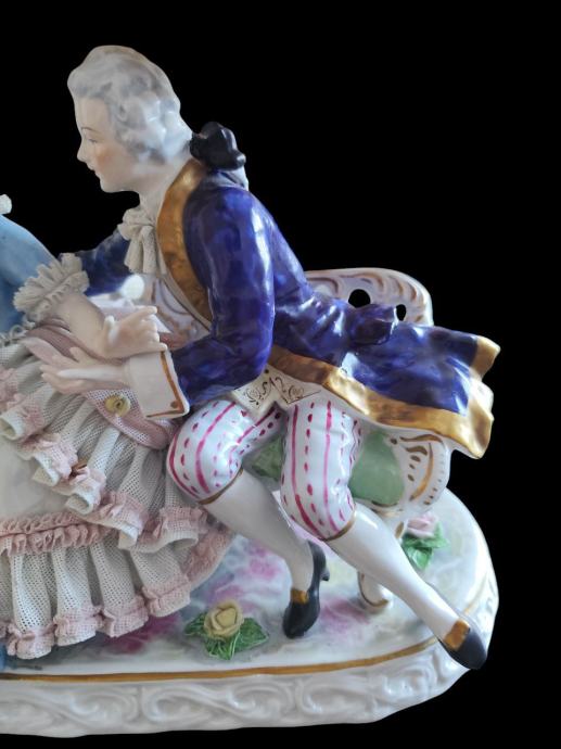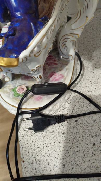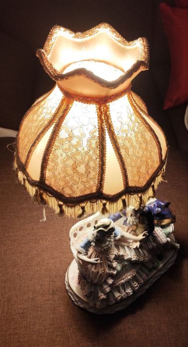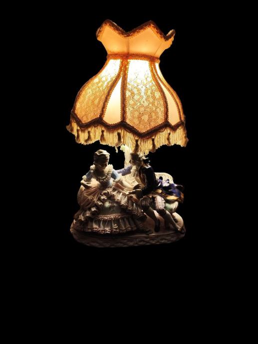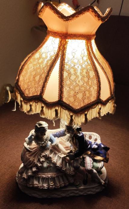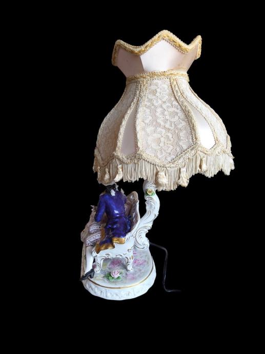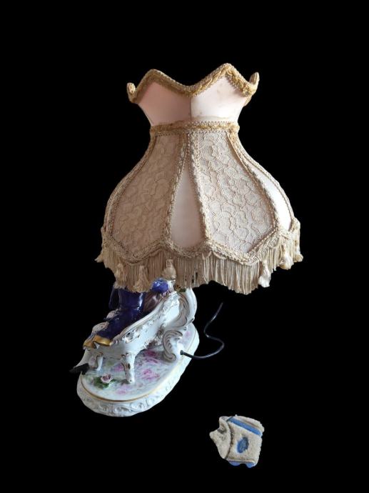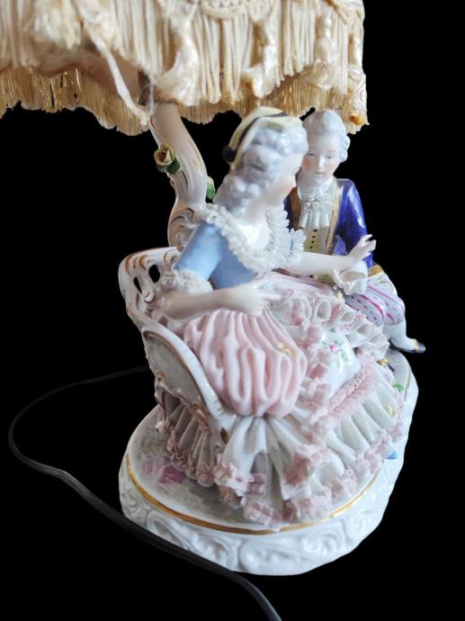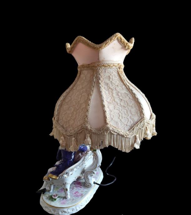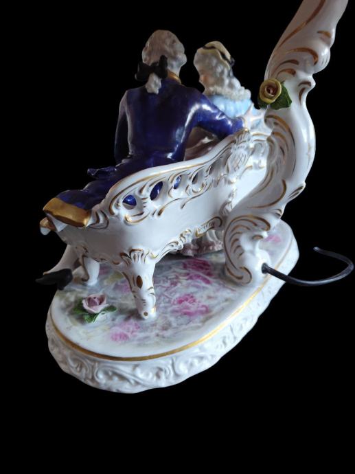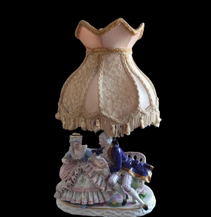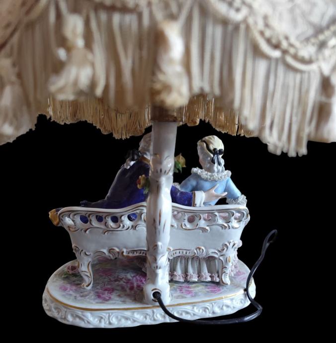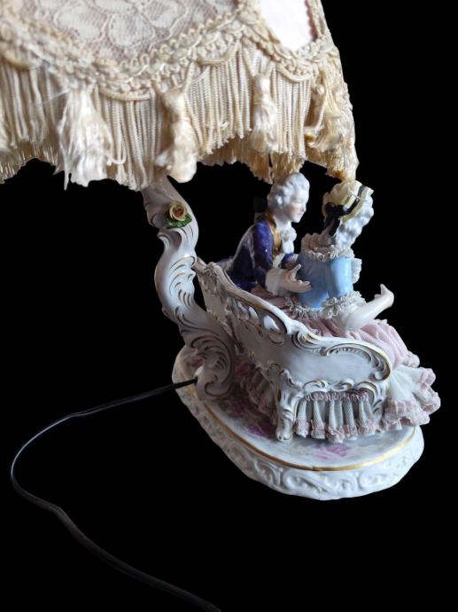 Izuzetno očuvana Dresden dekorativna stolna lampa od visokokvalitetnog porculana. Lampa prikazuje romantičnu scenu udvaranja, s detaljno izrađenim figurama plemića i dame u raskošnoj odjeći.