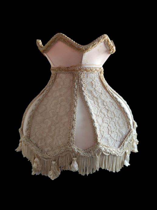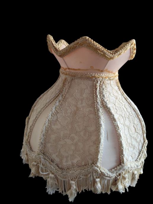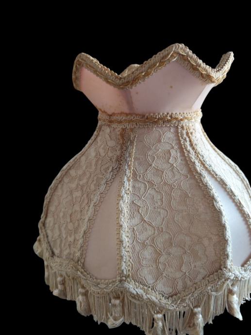 Lampaa je u nježnoj boji breskve/ružičastoj, ukrašeno elegantnom čipkom i resama koje daju toplu, ambijentalnu svjetlost.