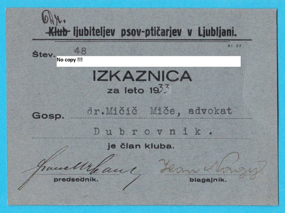 Društvo ljubiteljev psov-ptičarjev in Ljubljana -čl. iskaznica iz 1933