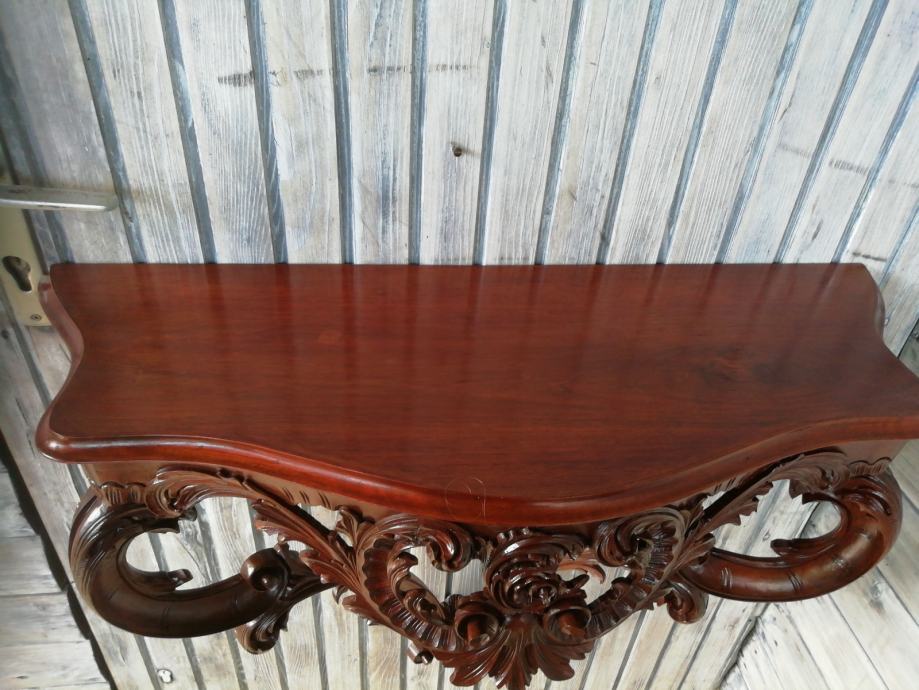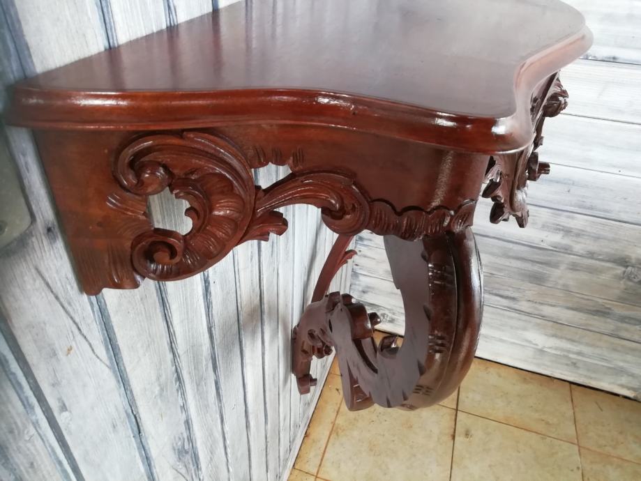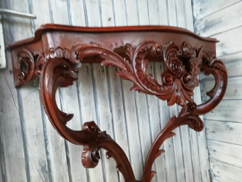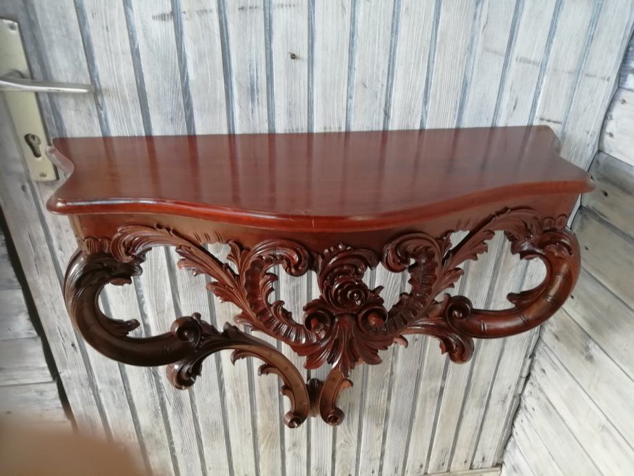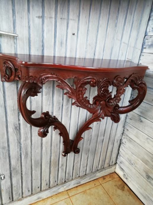 Predivna drvena konzola, rezbarena i restaurirana. Duzina 81 cm i visina 66 cm. Cijena konzole je 240 eura.