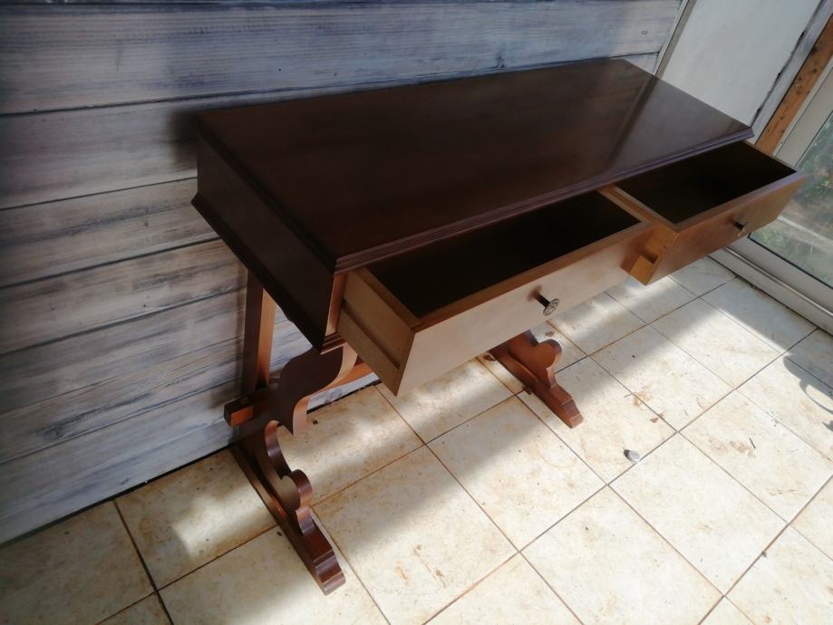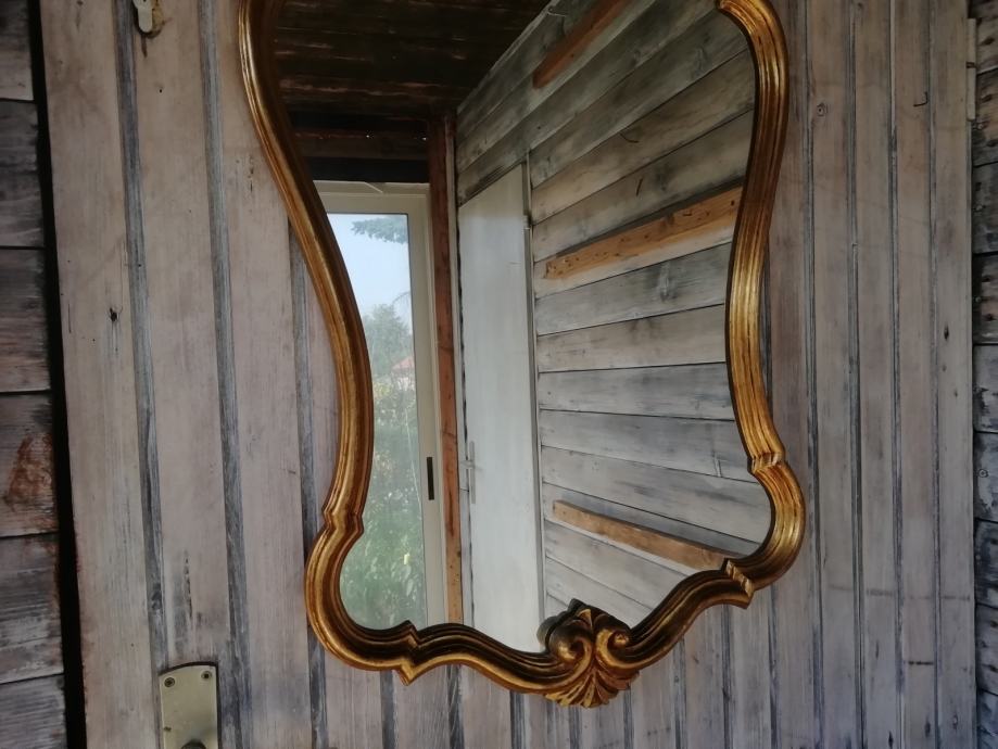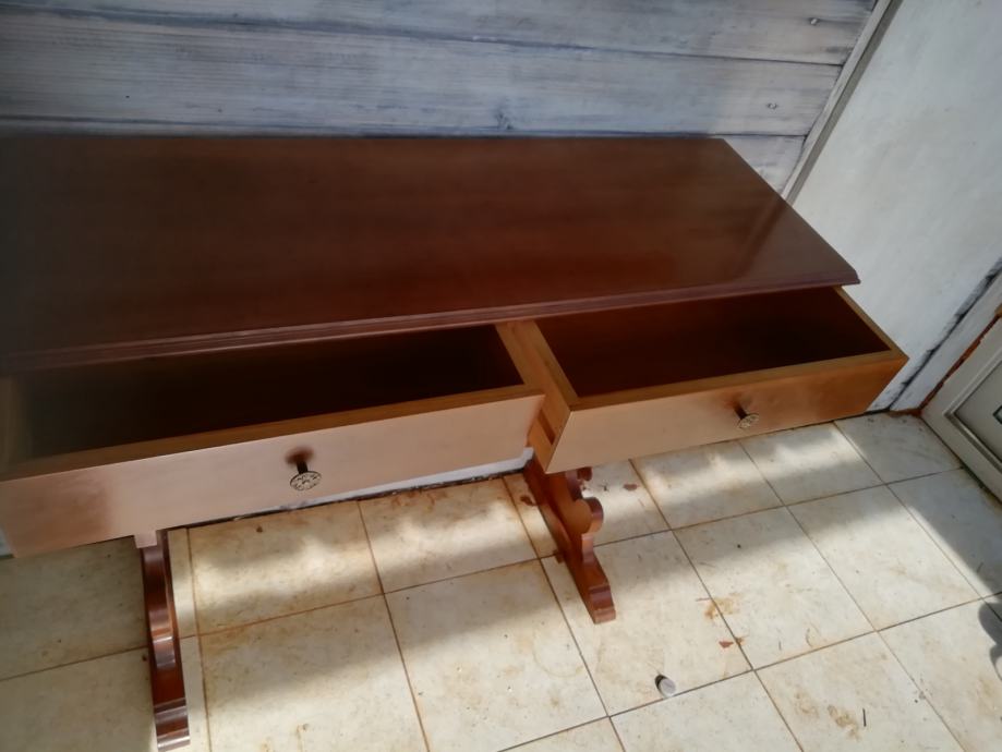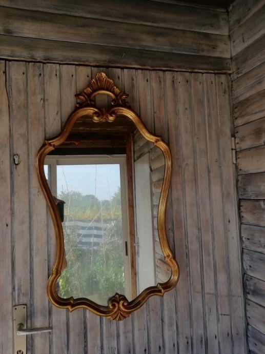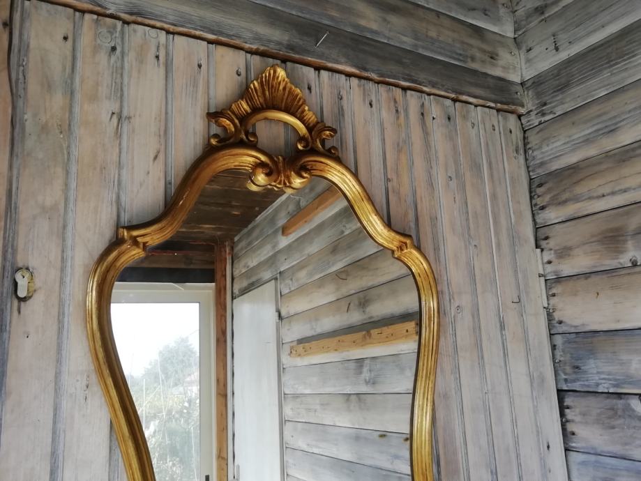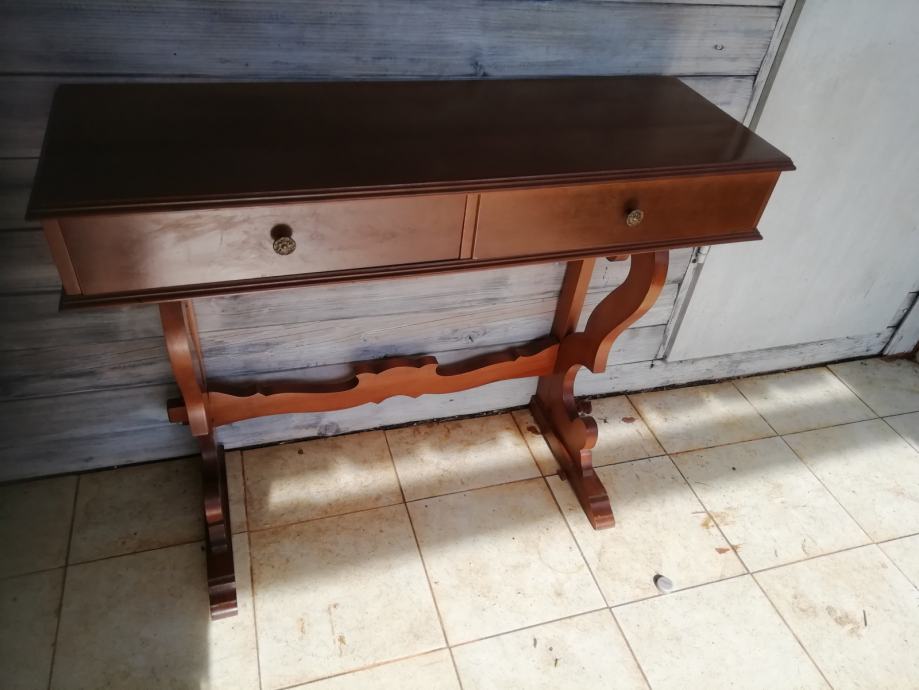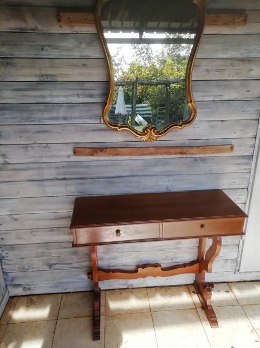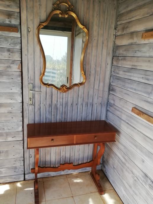 Drvena konzola i pozlaceno ogledalo u odličnom stanju. Dimenzije konzole: sirina 93 cm, dubina 31 i visina 77 cm. Dim. ogledala visina 97 cm, i sirina 51 cm, Moze se kombinirati i druga kombinacija, konzola i drugo smede drveno ogledalo.