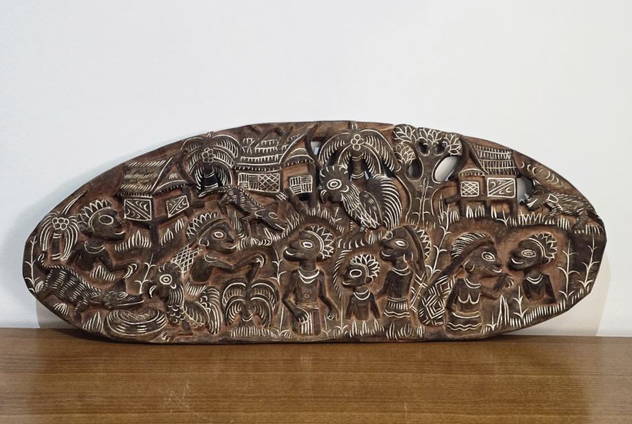 Prikazuje tradicionalne motive života u afričkom selu – figure ljudi, životinja, kućica i prirode, sve izvedeno u bogatom reljefu sa finim detaljima.