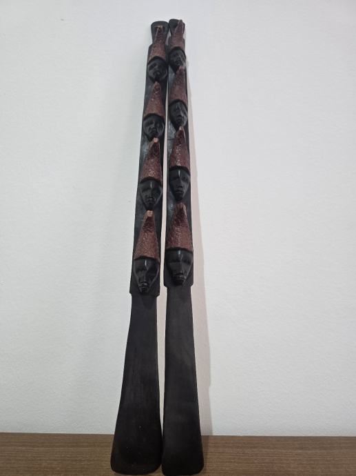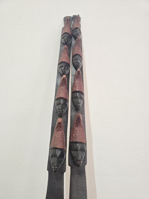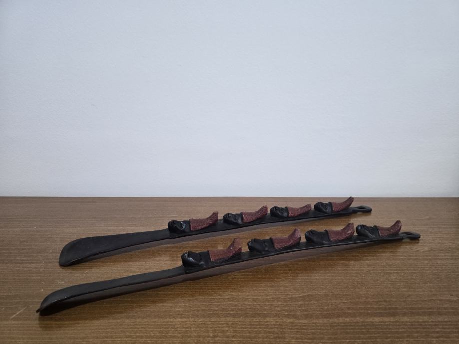 Prodajem unikatne ručno rezbarene drvene kašike za cipele s prepoznatljivim afričkim motivima. Izrađene su od tamnog drveta, s detaljno oblikovanim licima i dekorativnim elementima u gornjem dijelu.