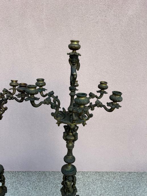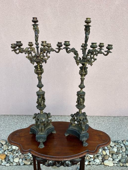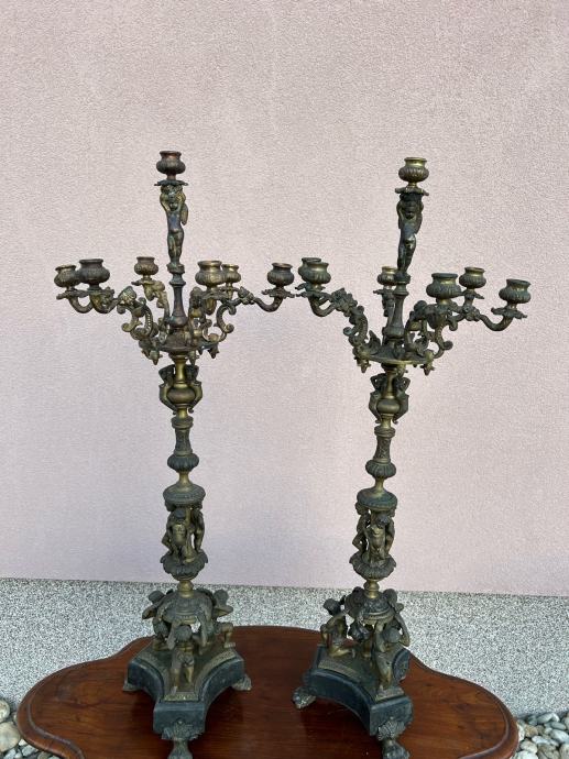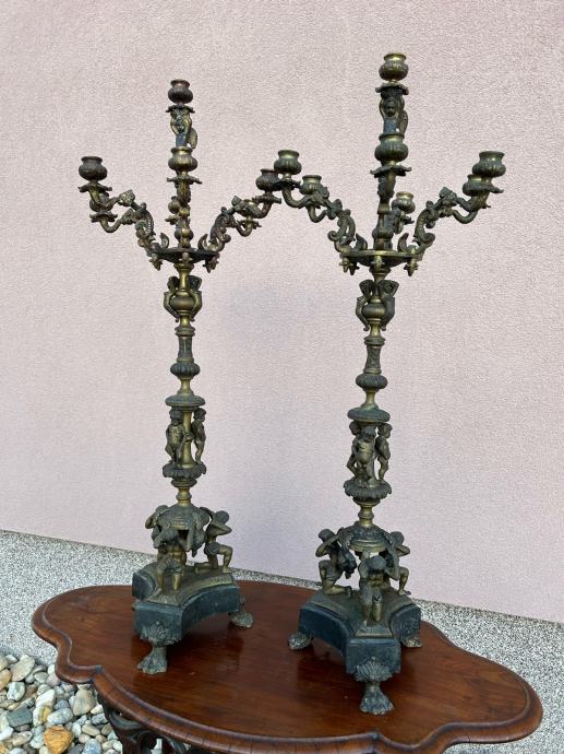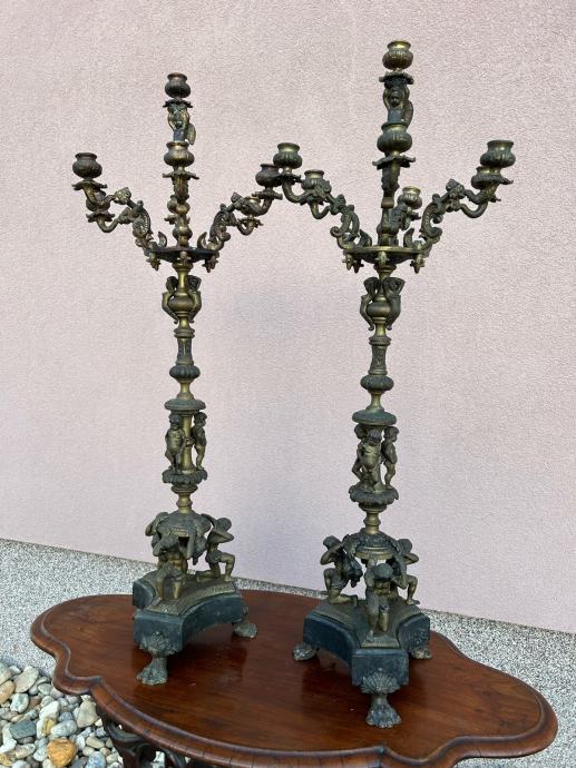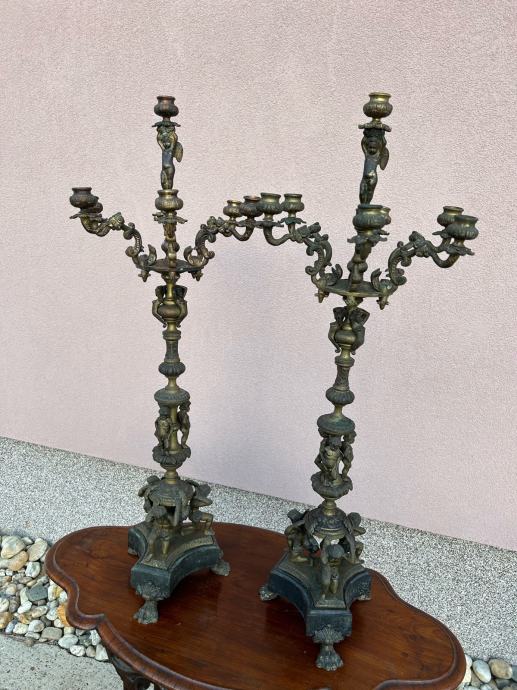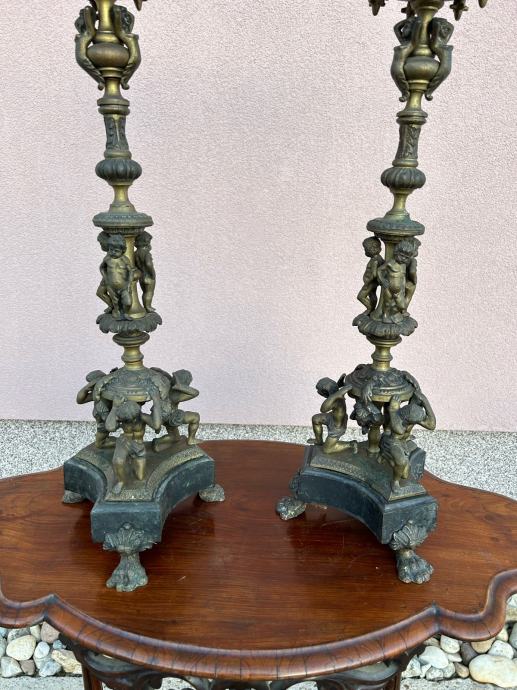 Dva velika stara svjecnjaka sa krasnim odljevima u svakakvim oblicima i mramornim postoljem.