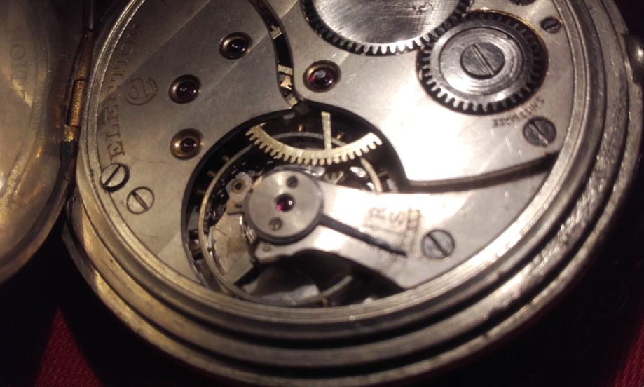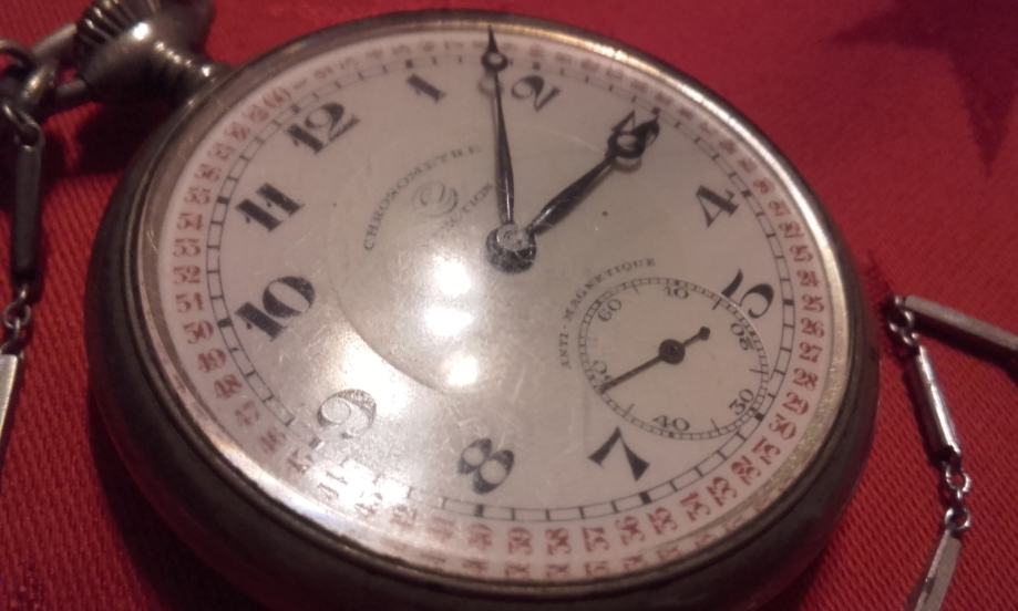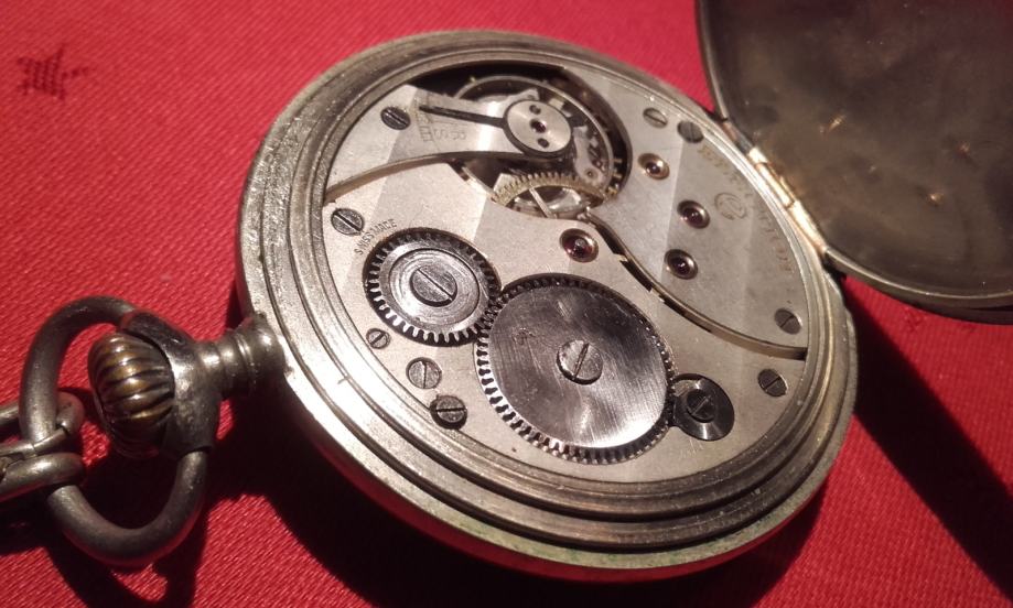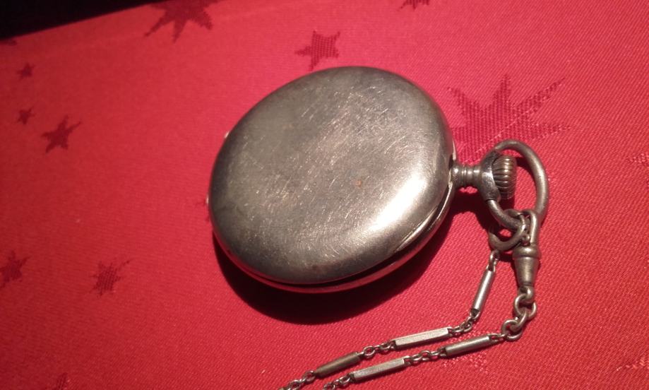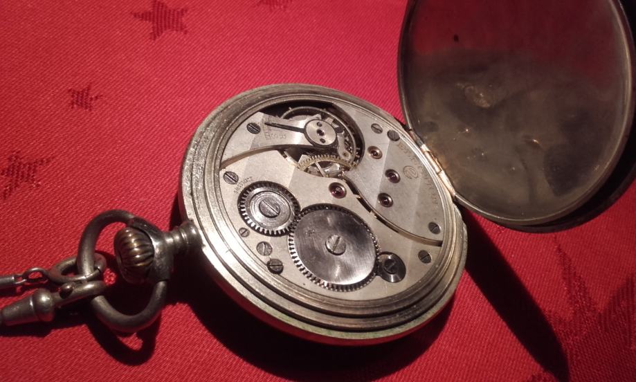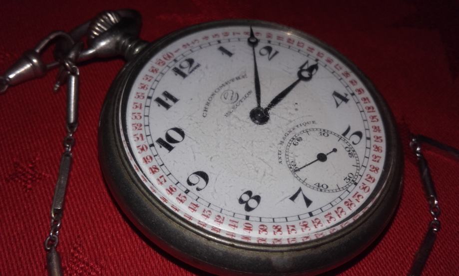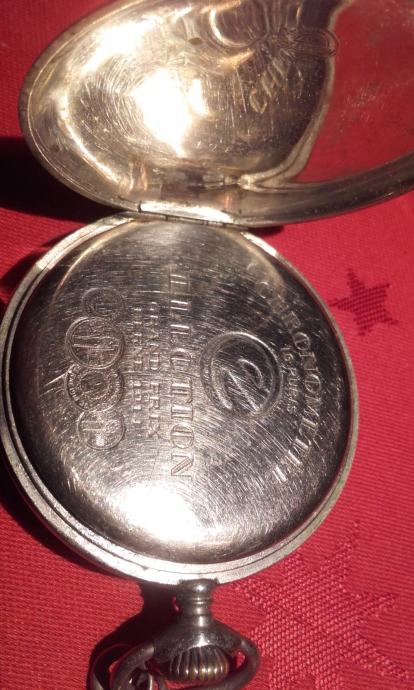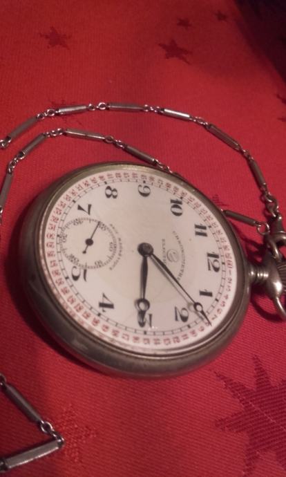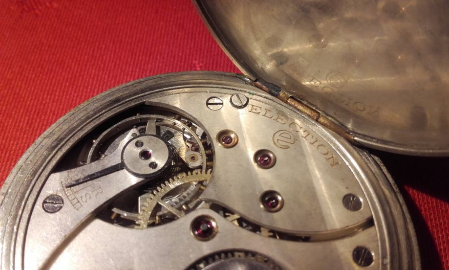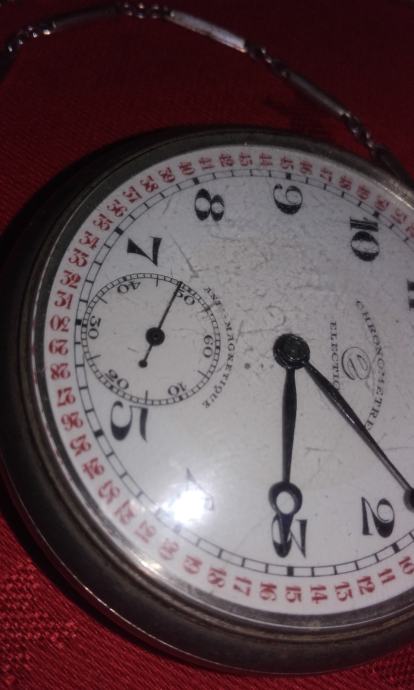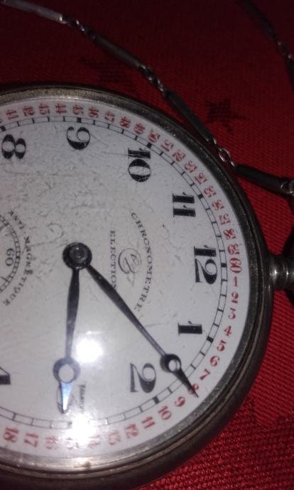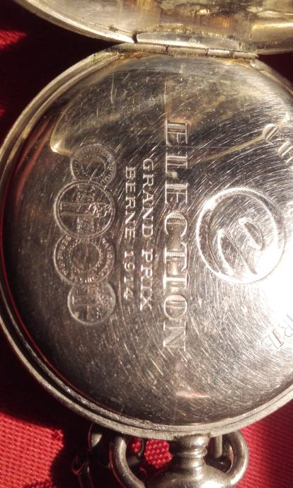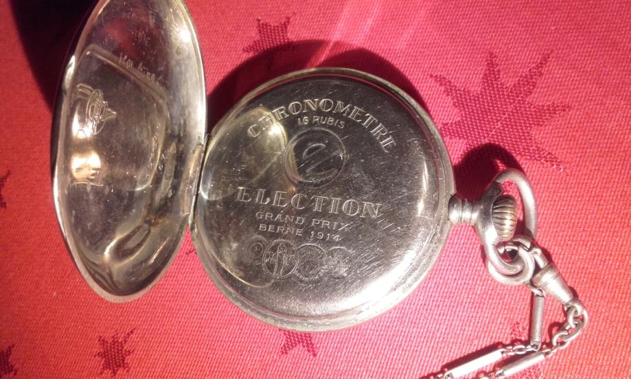 ELECTION CHRONOMETRE SWISS MADE (Fabrique Election SA, La-Chaux-de Fonds, Switzerland) s 16 rubinskih ležajeva, NATIONAL GRAND PRIX 1914., do tada ukupno 4 nacionalne švicarske medalje, autentično stanje, s originalnim lančićem. Pozlaćen unutarnji poklopac, rimski brojevi, oznaka ANTI - MAGNETIQUE, skazaljka sekundarka i posebno crveno significirane sekunde na rubu. Kućište glatko, bez reljefa bočno ili na poleđini. Servisiran 4 puta (oznake na unutarnjoj strani poklopca). Serijski broj 194389 - podbroj 67.