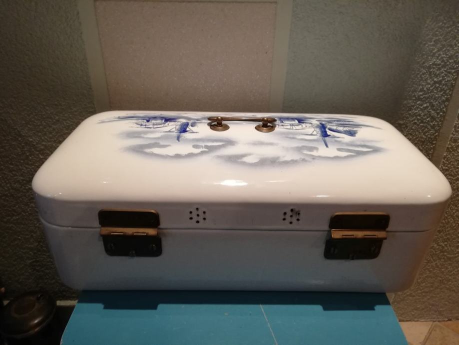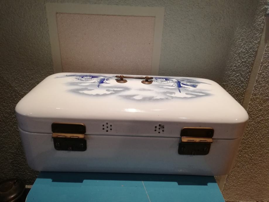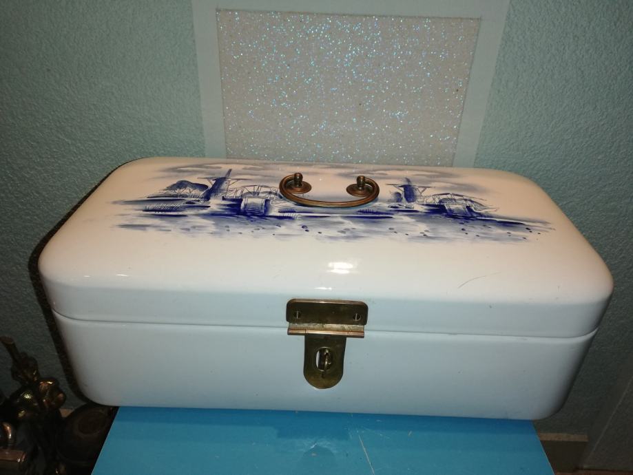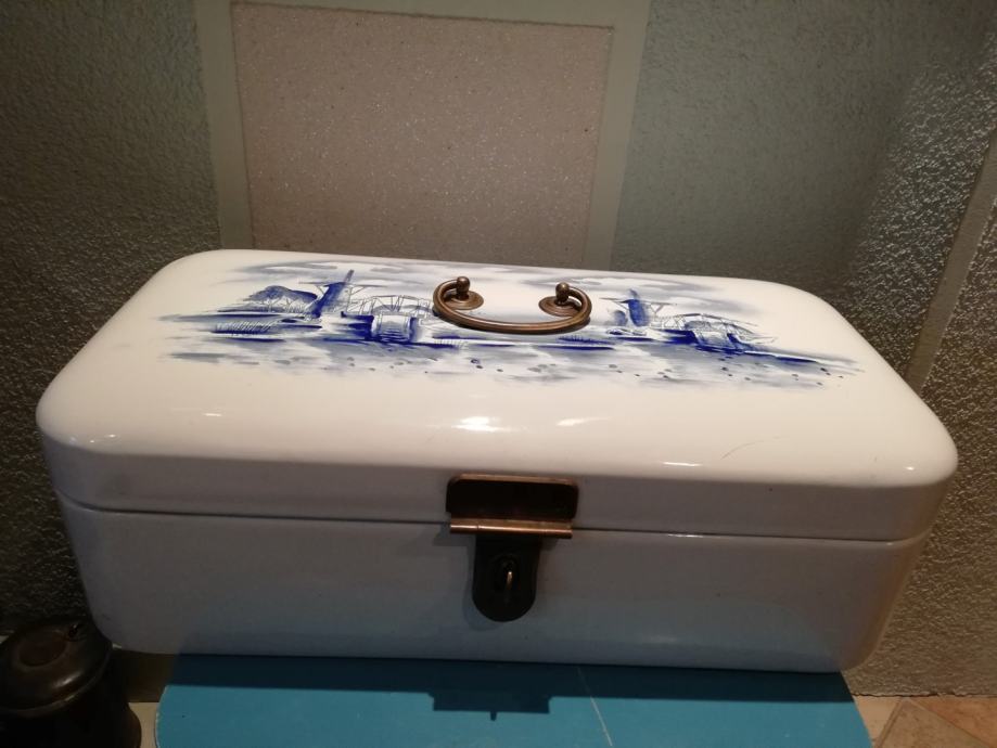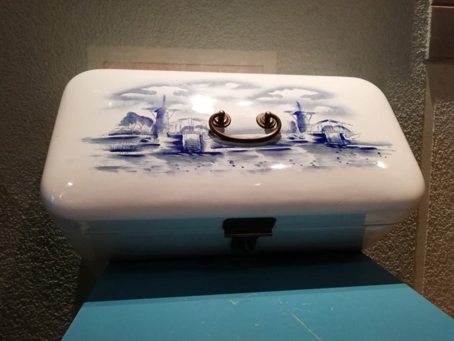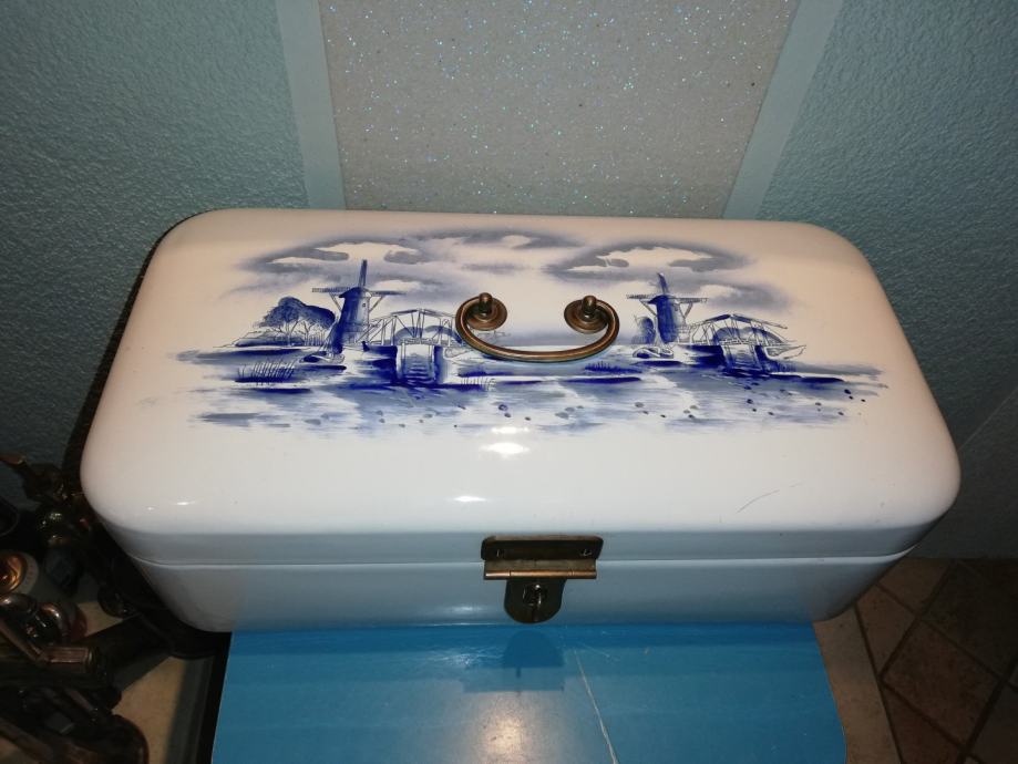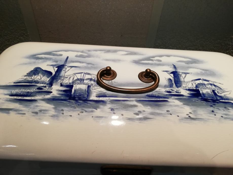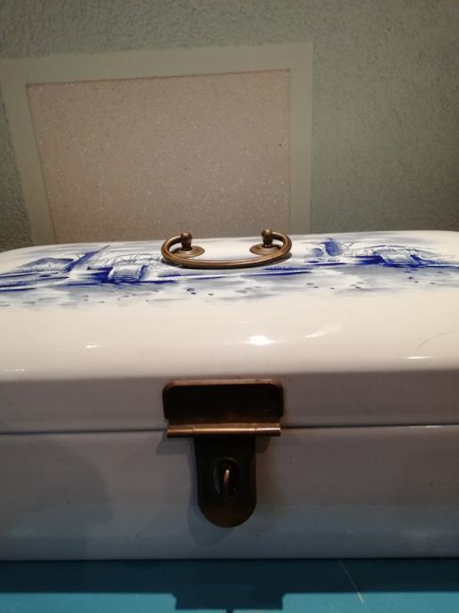 Stara emajlirana kutija za kruh; jugendstil; motivi: Nizozemska; sačuvano, neoštećeno, iz privatne kolekcije, ocjena stanja: 5/5; dimenzije. širina. 48,0 cm, dubina: 24,0 cm, visina. 16.5 cm ( visina sa ručkom: 21,0 cm); materijal: emajlirani (porculanizirani) metal; okov, ručke: puni mesing.
