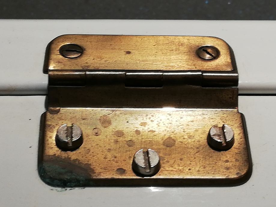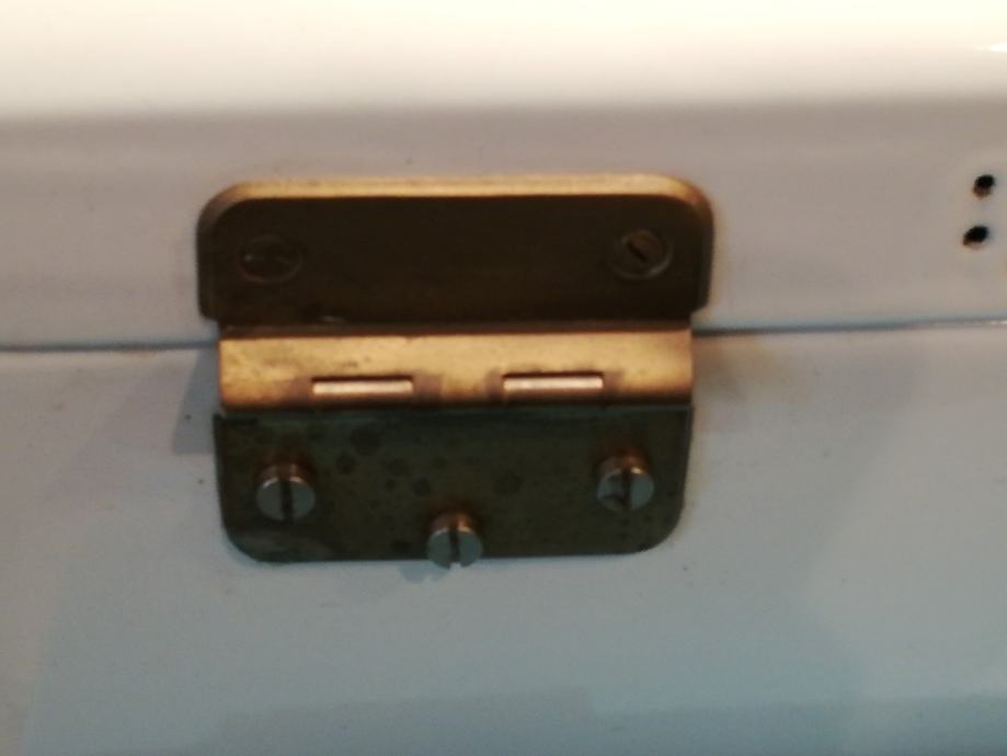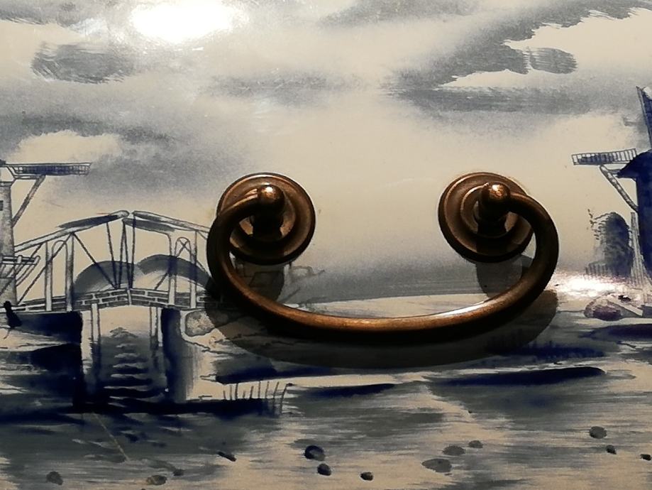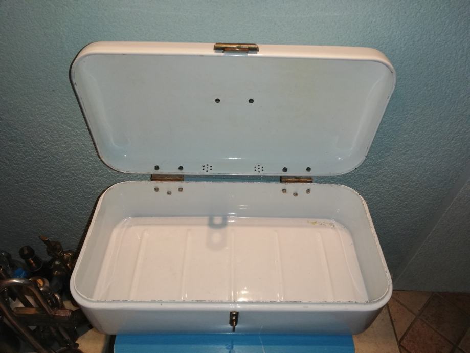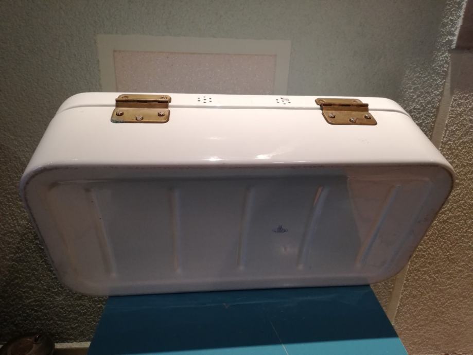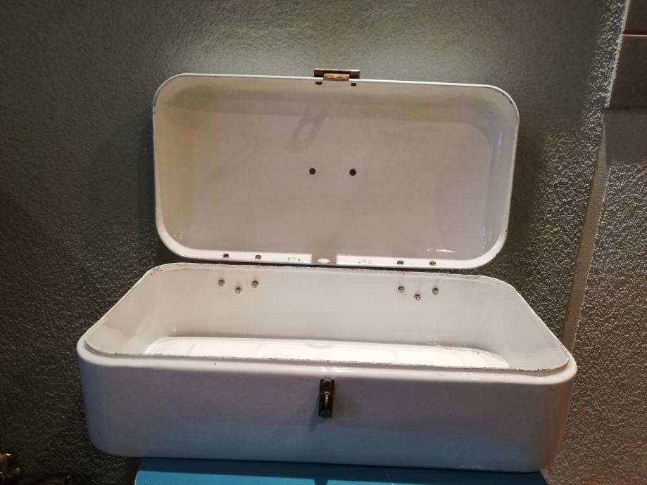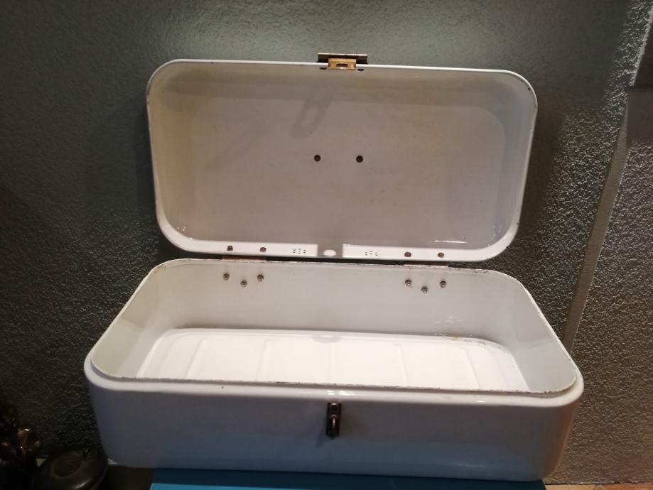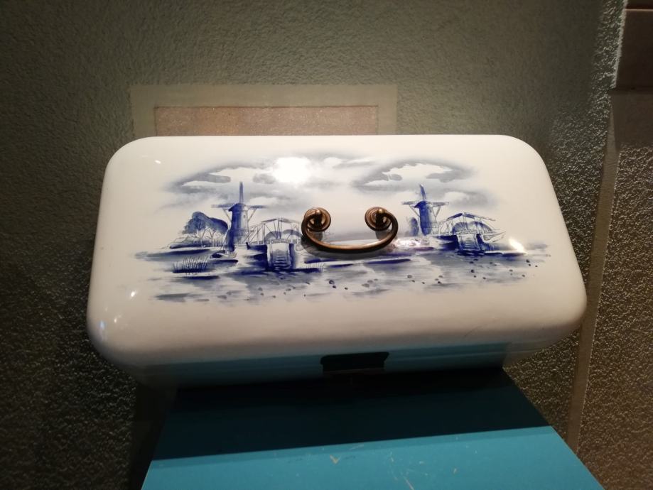 Stara emajlirana kutija za kruh; jugendstil; motivi: Nizozemska; sačuvano, neoštećeno, iz privatne kolekcije, ocjena stanja: 5/5; dimenzije. širina. 48,0 cm, dubina: 24,0 cm, visina. 16.5 cm ( visina sa ručkom: 21,0 cm); materijal: emajlirani (porculanizirani) metal; okov, ručke: puni mesing.