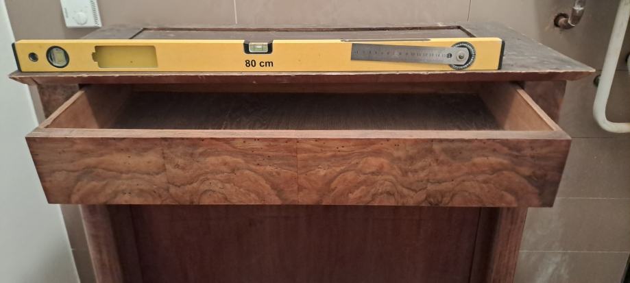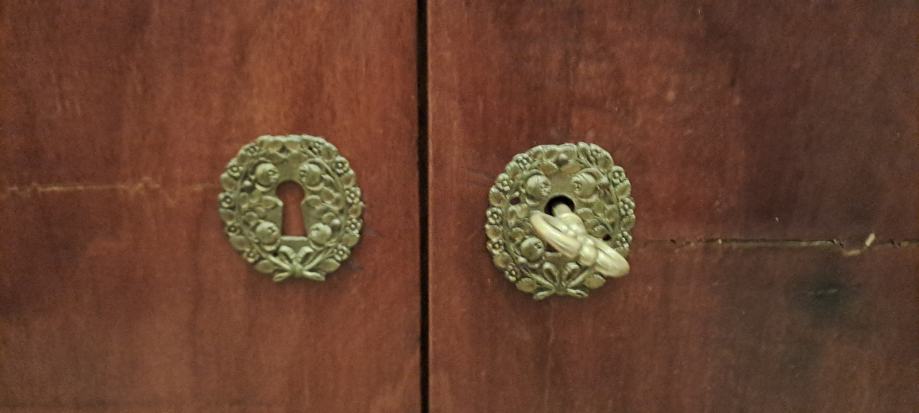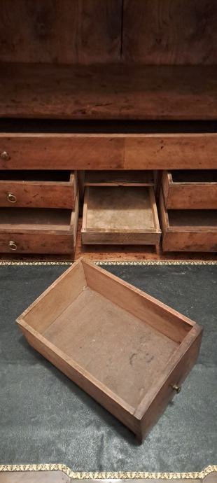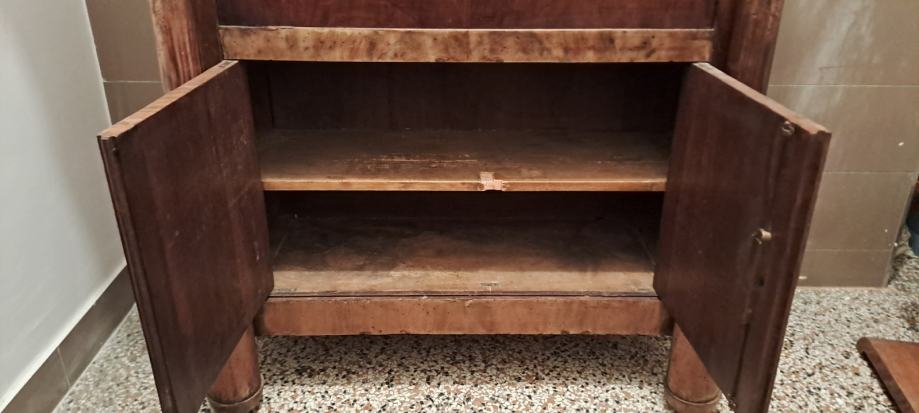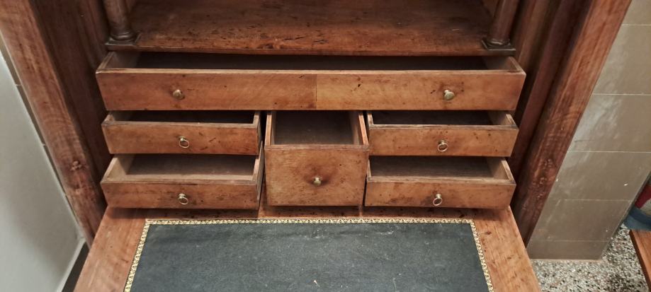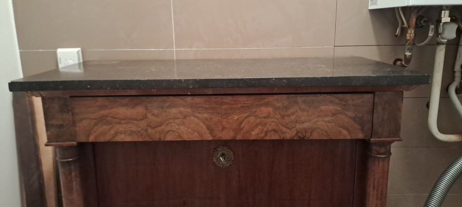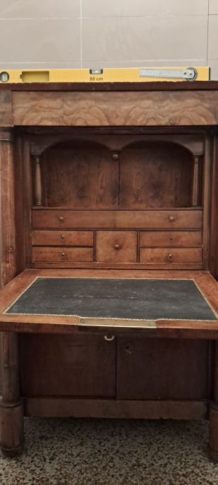Empire sekreter, 2 vrste furnira, na bočnim stranicama debljine 5 mm, tajni pretinac, bravice su ispravne, uščuvan. Visina 145 cm. Mramorna ploča 98x55x2 cm.