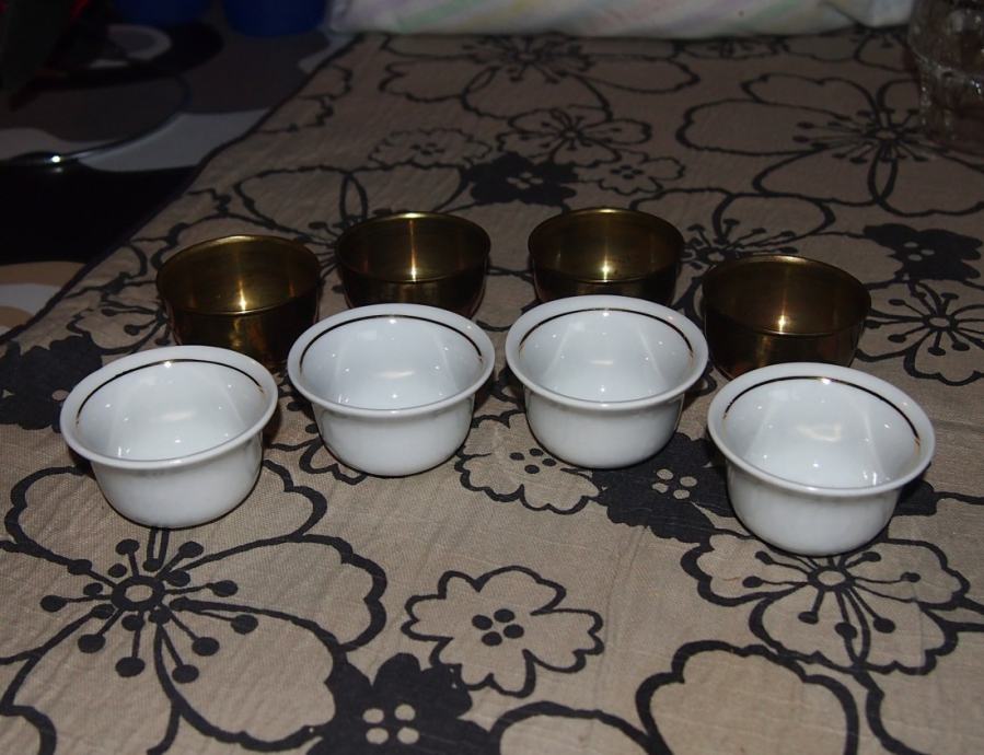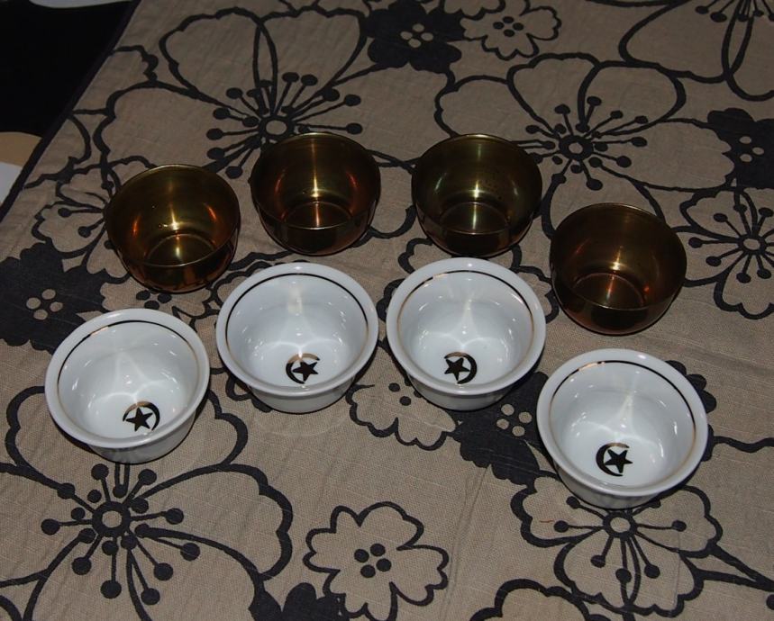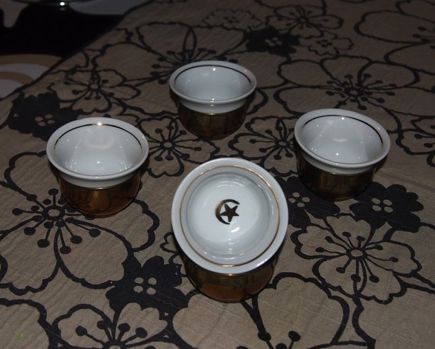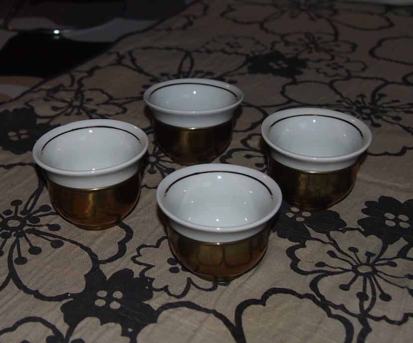 Set od 4 stara porculanska fildžana (Jugokeramika) u mesinganim držačima. Odlično očuvano.