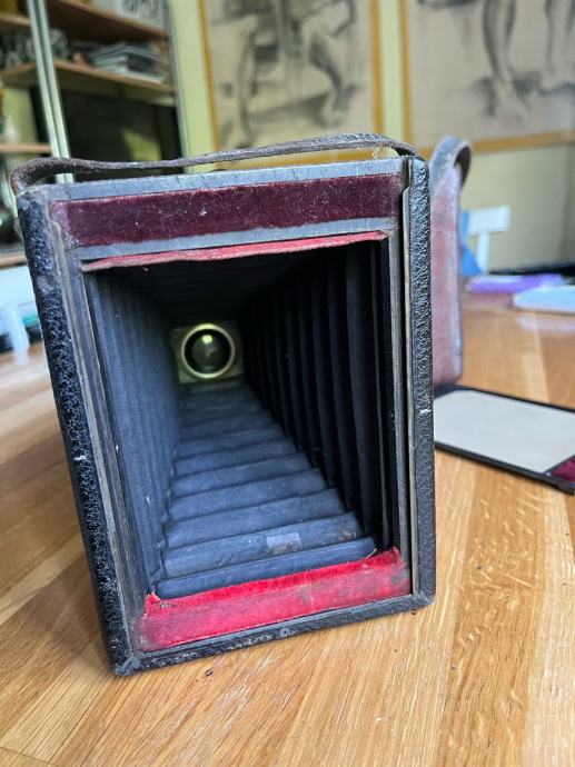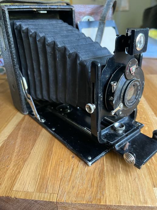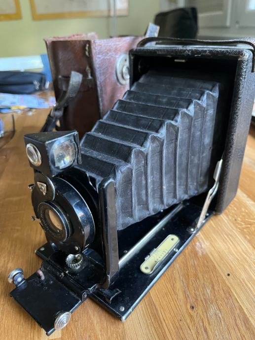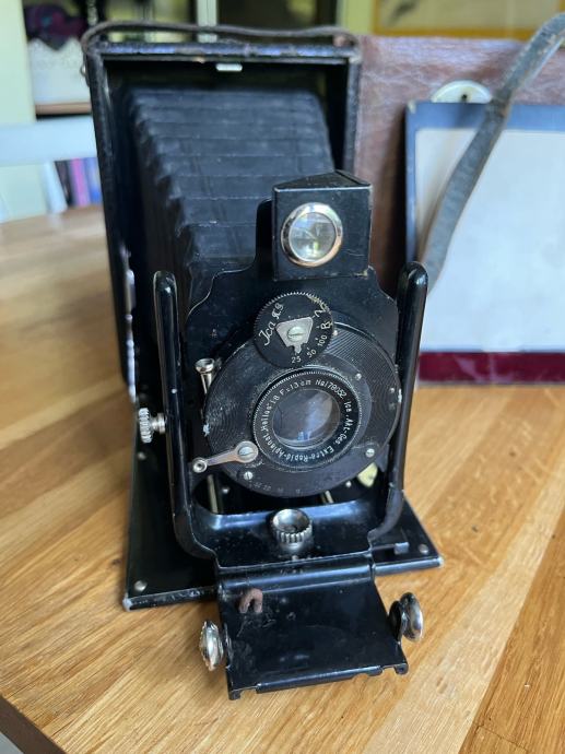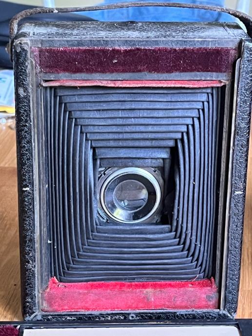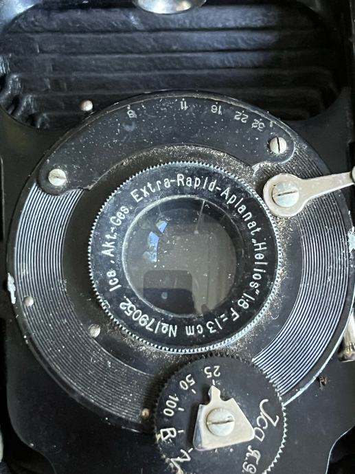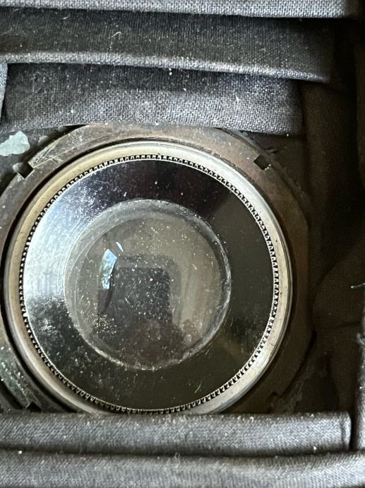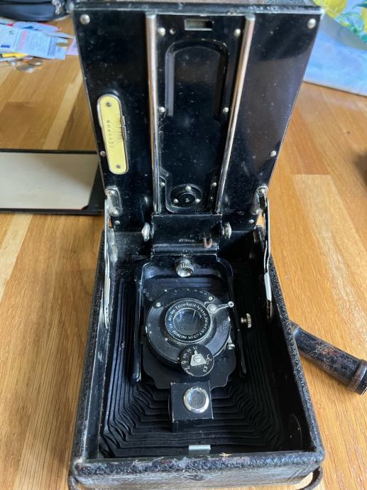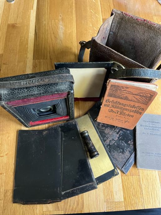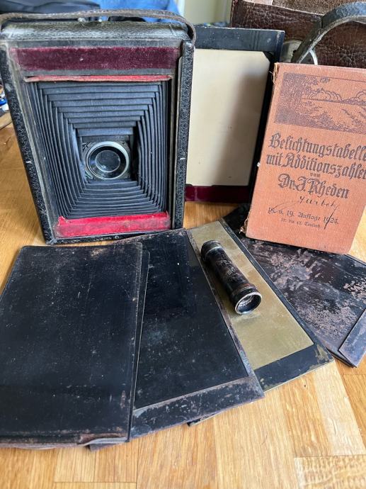 Fotoaparat kako je vidljivo i sa slika , sa torbicom , objektivom , ,, pločama ,, i dvije knjižice .
