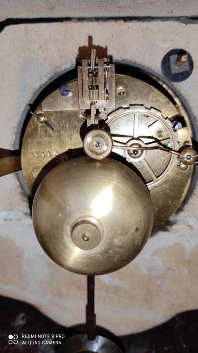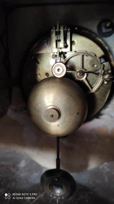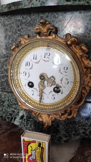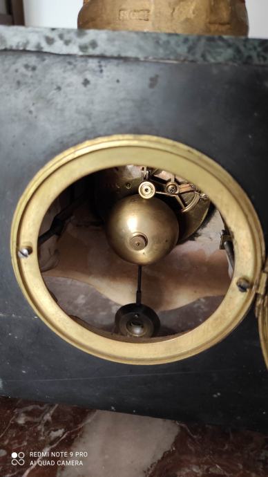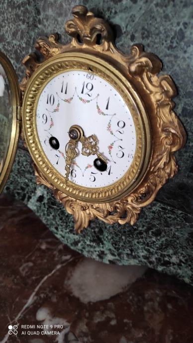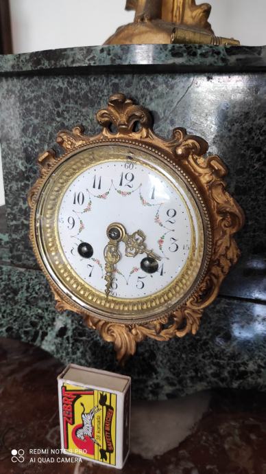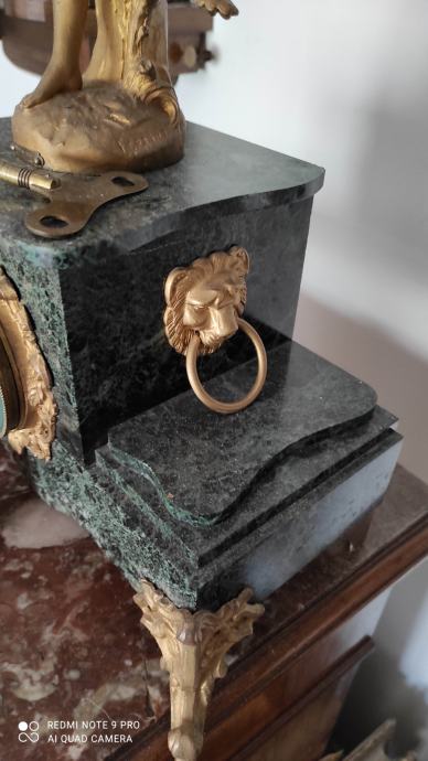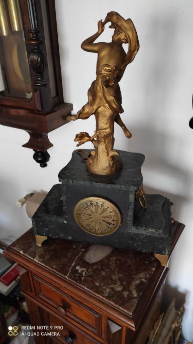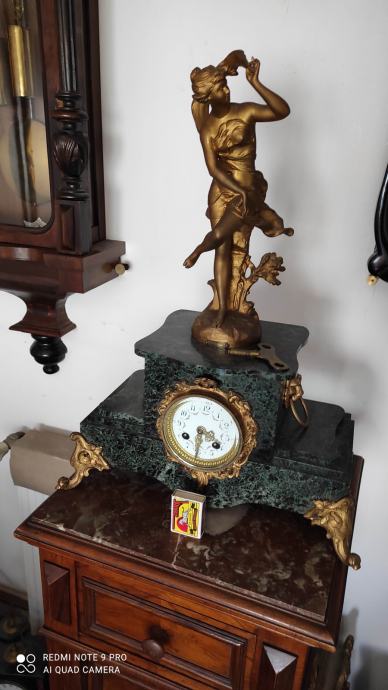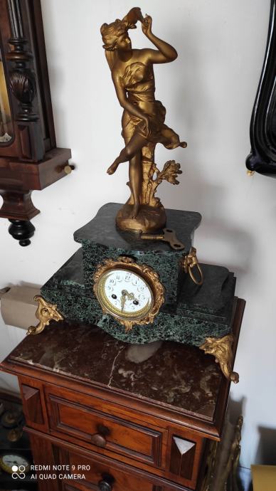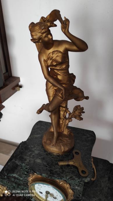 Francuski sat sa figurom COUP DE VENT, par FERRAND cca. 1880 .Postolje tamno zelenkasti mramor. Veličina;52 cm visina,35 cm širine i cca 16 cm dubine.