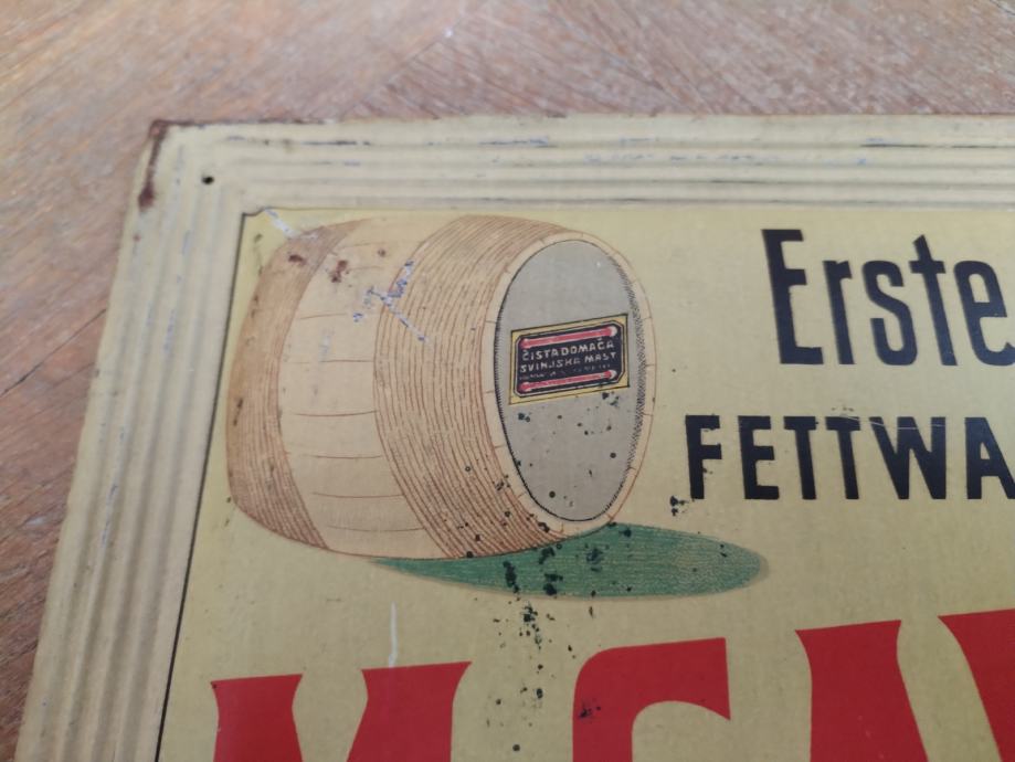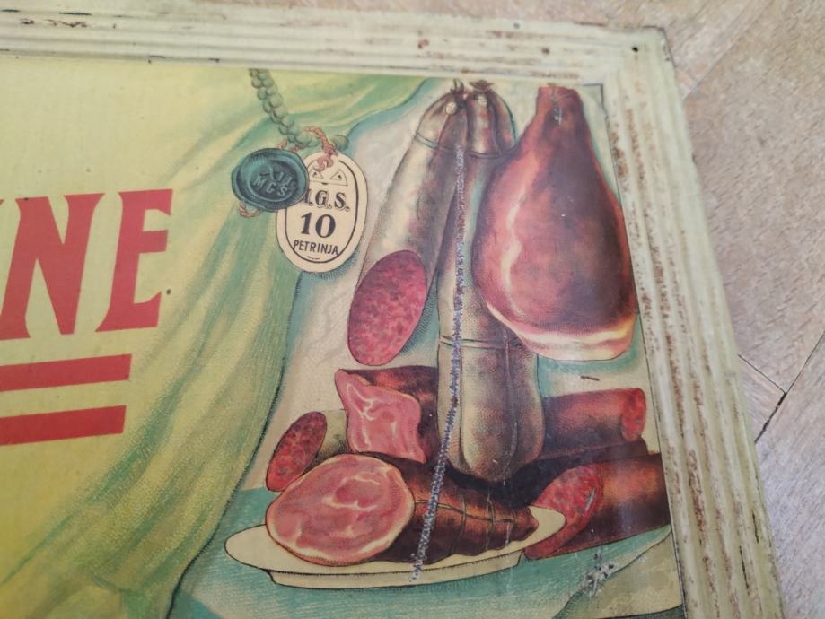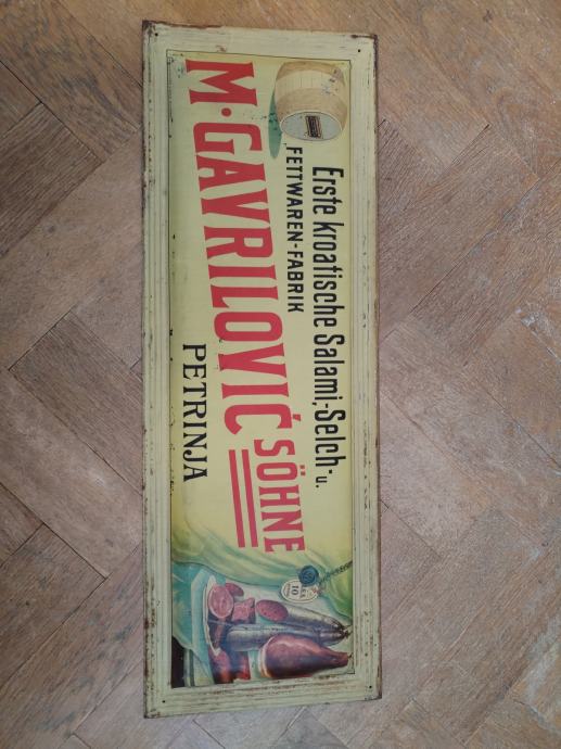 RIJETKA I DOBRO OČUVANA LIMENA PLOČA, REKLAMA KOJU SU IMALI TRGOVCI KOJI SU PRODAVALI DOMAĆU MAST, SALAME I OSTALE SUHOMESNATE PROIZVODE FIRME GAVRILOVIĆ.