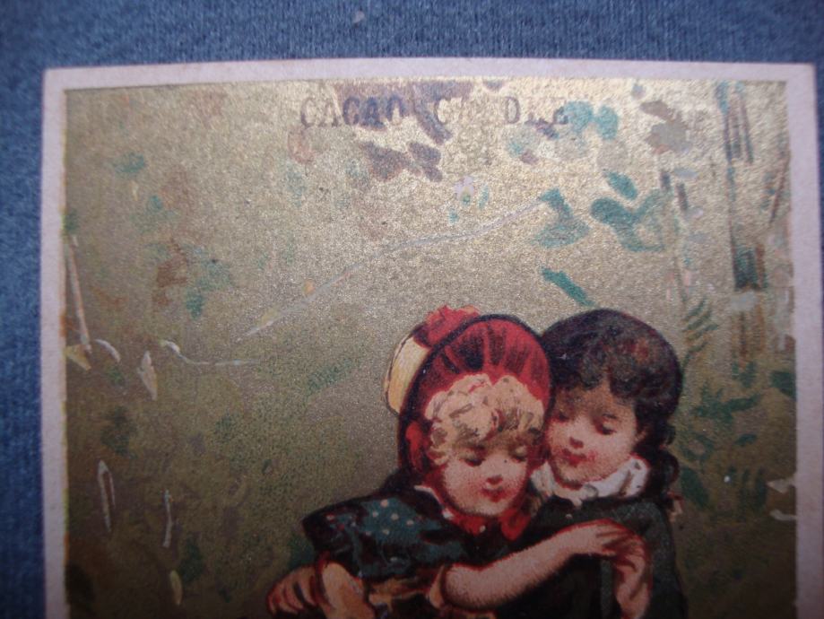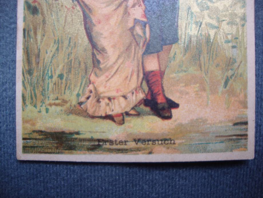 Stara kartonska reklama chromo kartica iz 19. stoljeća Erste Versuch (prvi pokušaj) zlatna ,dječak sa djevojćicom