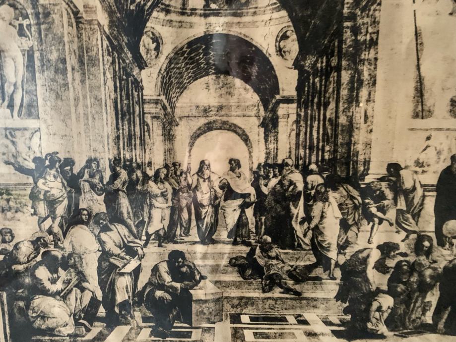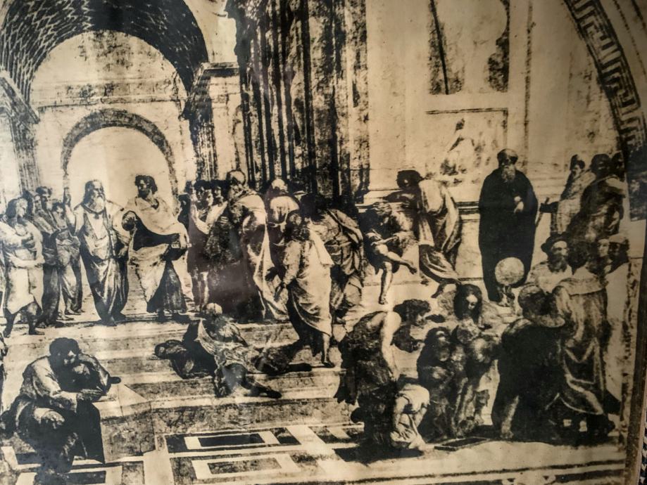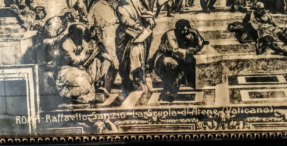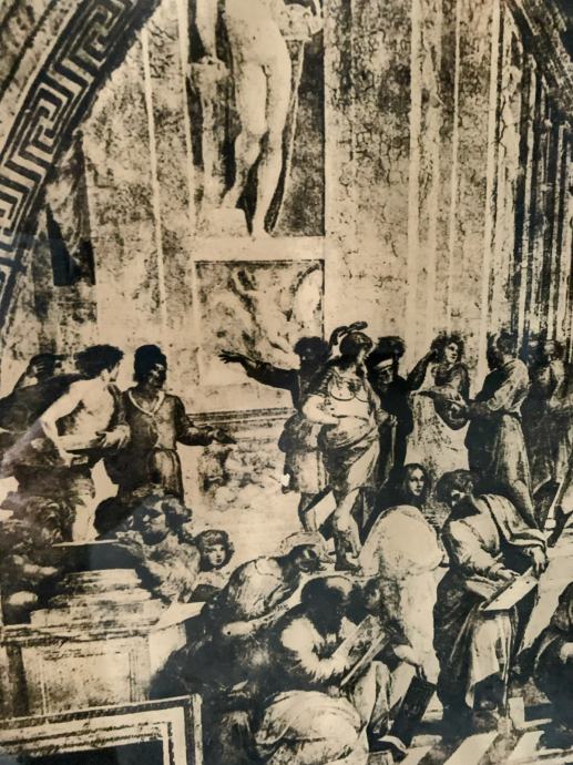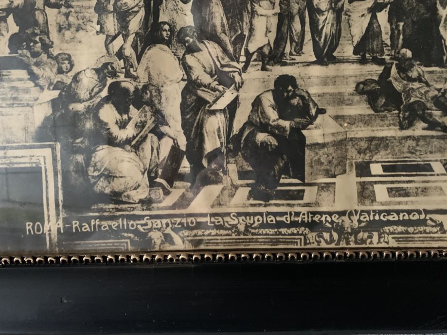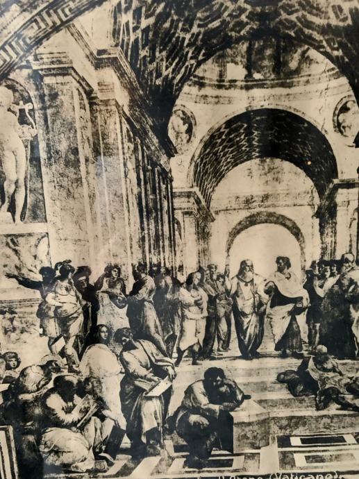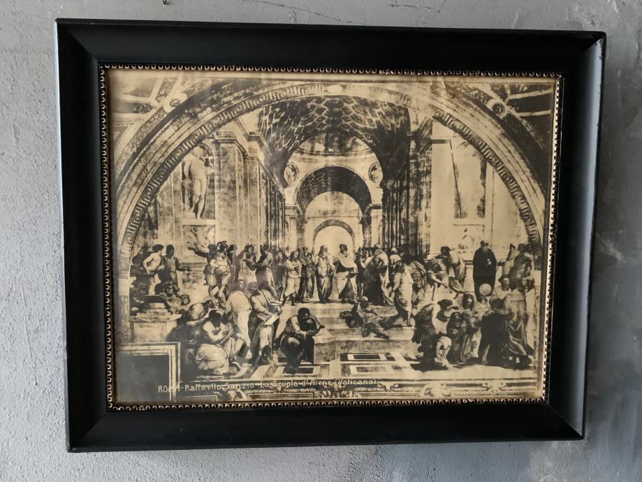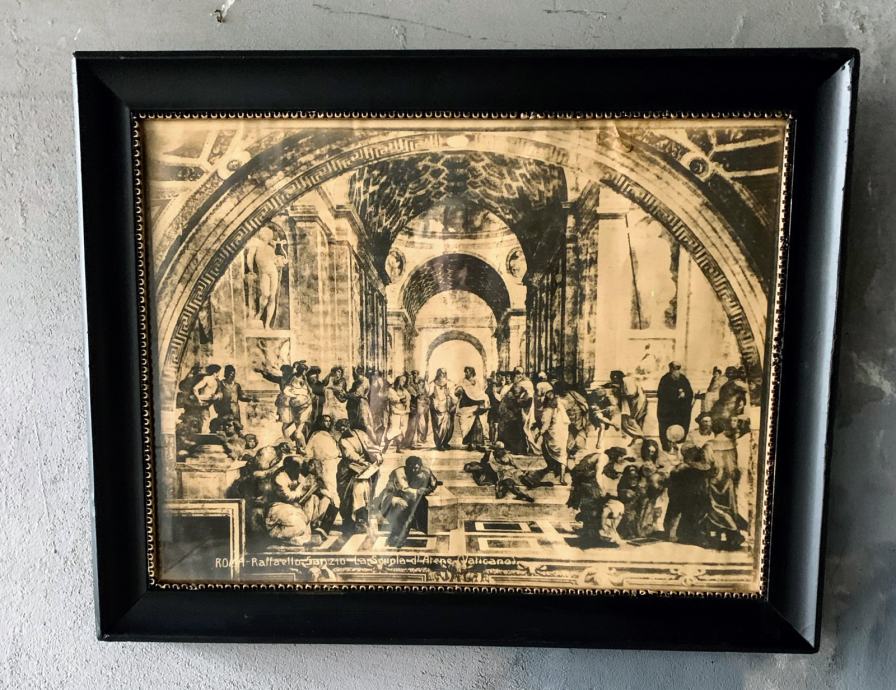 Prodajem grafiku po raffaellovoj freski iz Vatikana,skup filozofa.Dimenzije otiska 60x44cm.Vanjske mjere 72x46 cm.Odlicno izvorno stanje