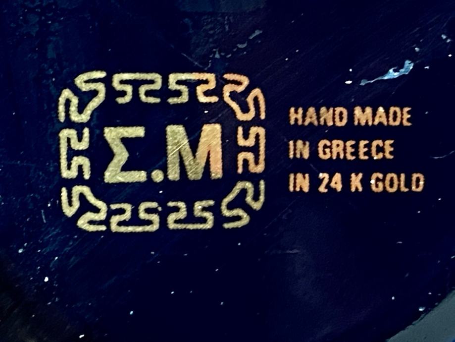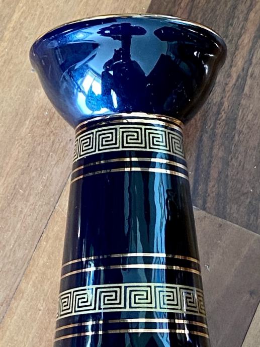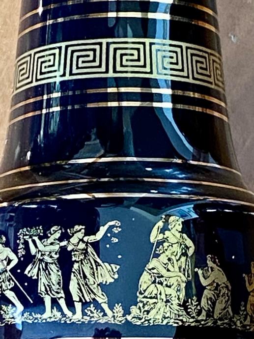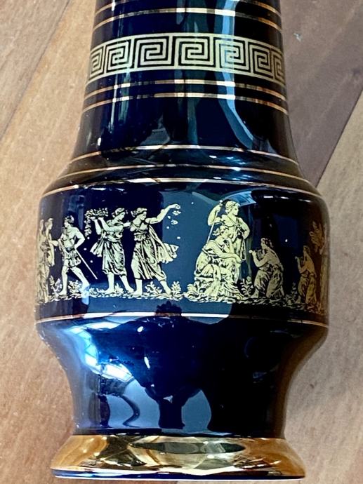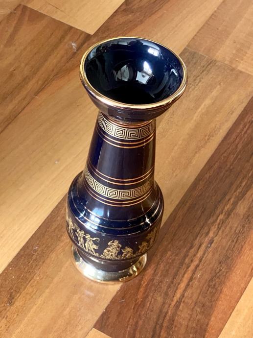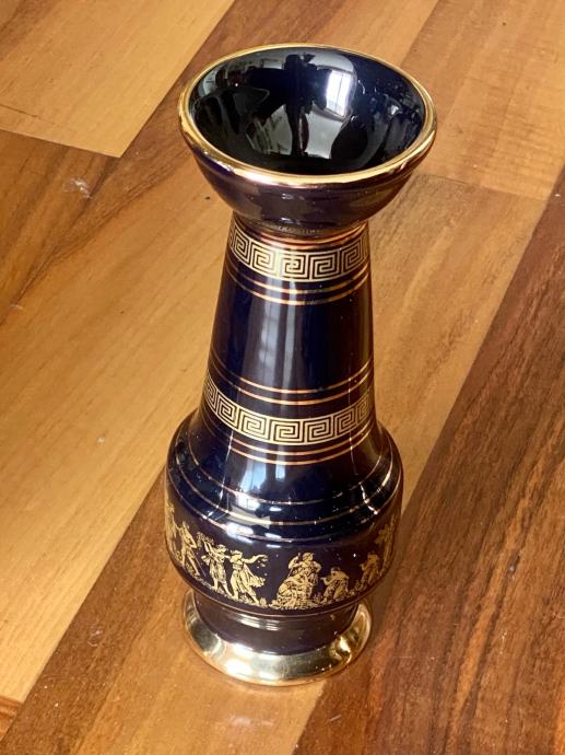 Prodajem grčku vazu od kobalta ručno oslikanu 24 karatnim zlatom. Vaza je visoka 21 cm, promjera 8 cm. U odličnom je stanju bez ikakvih oštećenja. Prodajem još tri slične grčke vaze i jedan ćup koje možete vidjeti u mojim oglasima. Svi zajedno čine malu kolekciju.
