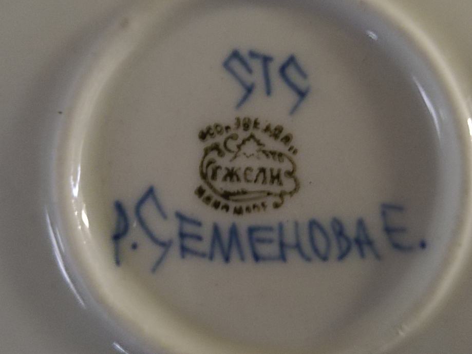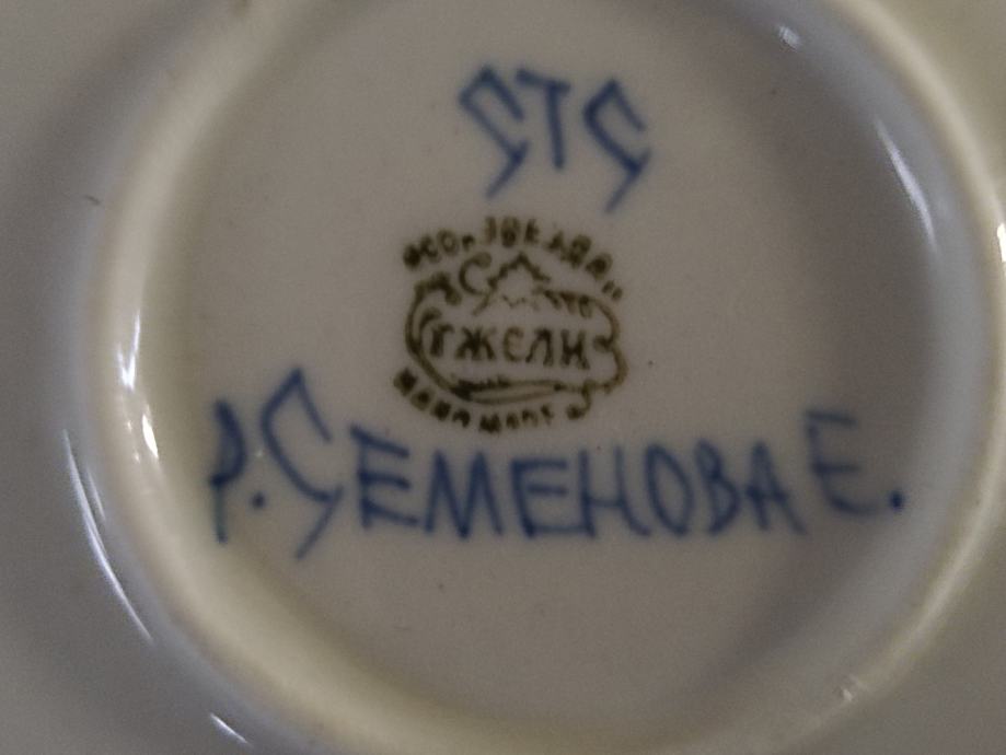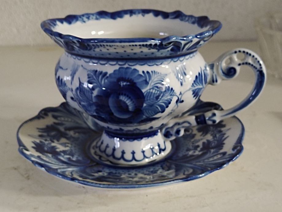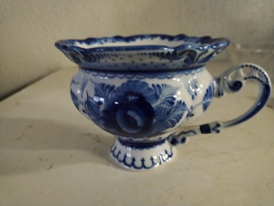 Prodajem potpuno očuvanu i neoštečenu keramičku šalicu i tanjurić. Ručni rad, proizvodnja Gzhel iz rusije. Potpisano kao P. Semenova E. I na tanjuru i na šalici. Ručni rad, staro je oko 50 godina. Dimenzije Š/V/Fi 14,5x8,5x11,5 cm.