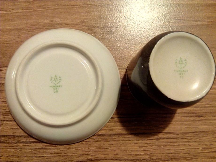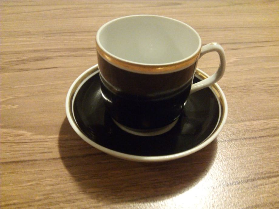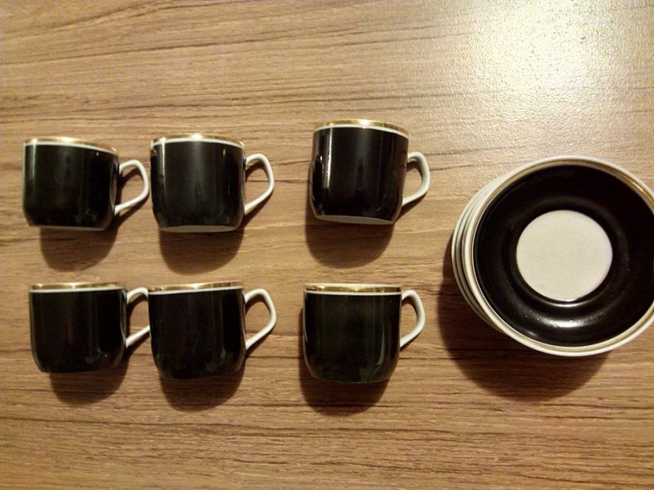 Art Deco stil. Antikni set - šest šalica s tanjurićima. Starost preko 60 godina. Materijal: Porculan Boja: crna, pozlaćeni rub. Dobro stanje, nigdje nije okrhnuto. Jedna šalica ima tanku pukotinu, vidljivo tek izbliza.