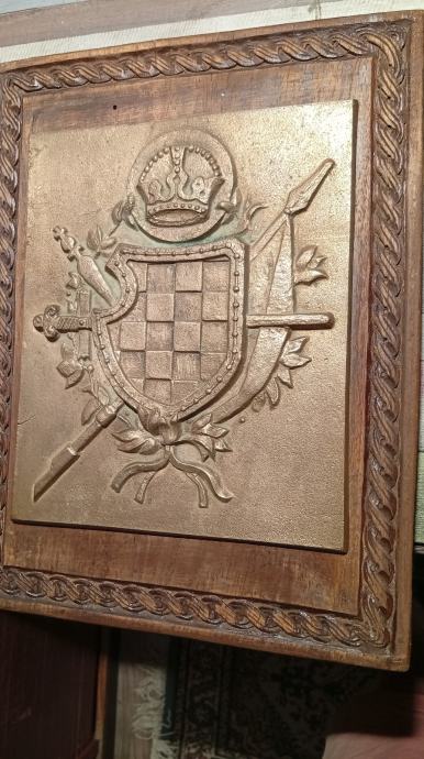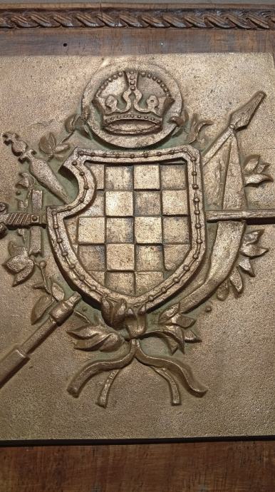 Jako rijedak hrvatski povjesni grb od ljevane bronce na drvenoj podlozi ukrašenoj u pleteru
