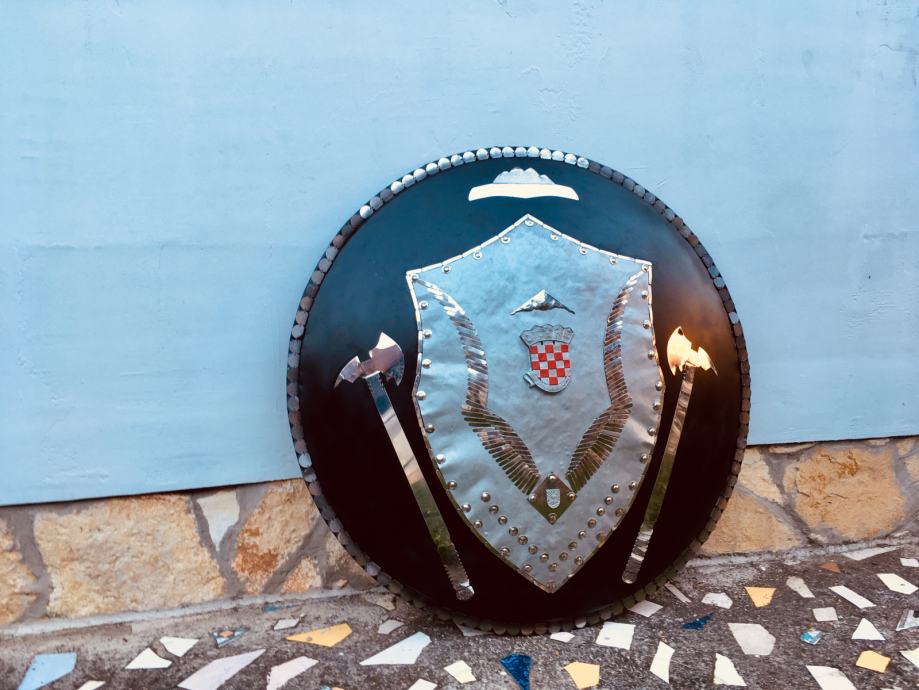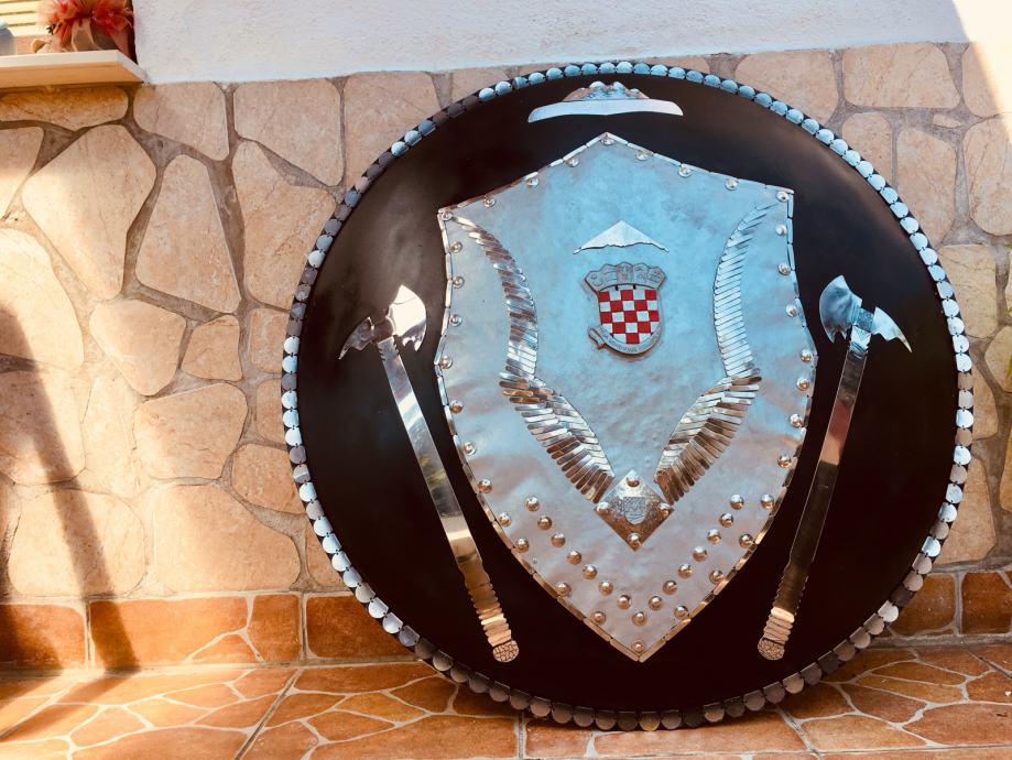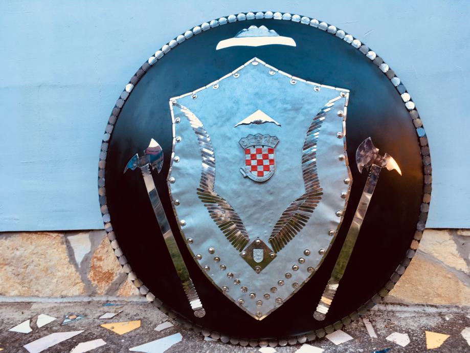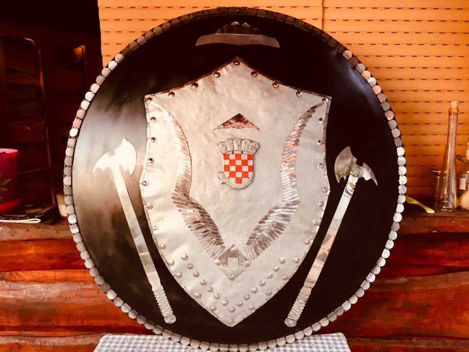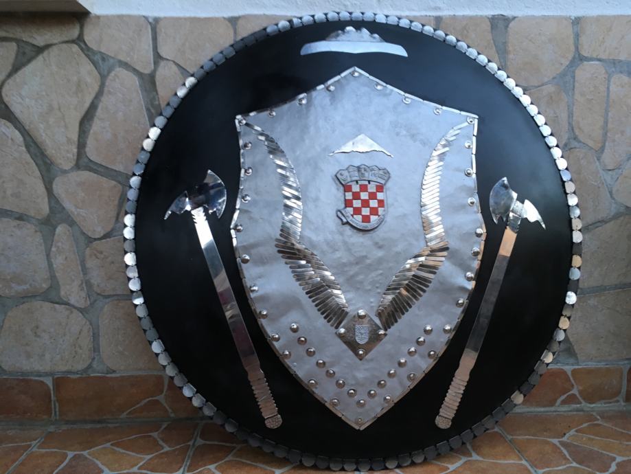 Hrvatski Štit velikih dimenzija od Inox Nehtđajućeg čelika sa grbom,sokolovima krilima i Helebardama,na poleđini rukohvat za držanje Štita. Dimenzije Štita su promjera 94cm čvrst i masivan,stanje novo,izrađen tehnikom kovanja u savršenom stanju. Ne šaljem poštom,preuzimanje osobno,cijena 205.Eura. Mogućnost dostave na autocestu u Karlovcu - naplatne kućice u Karlovcu.