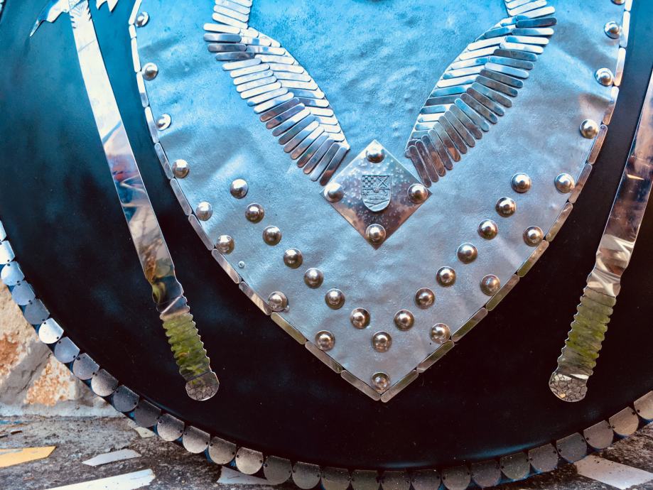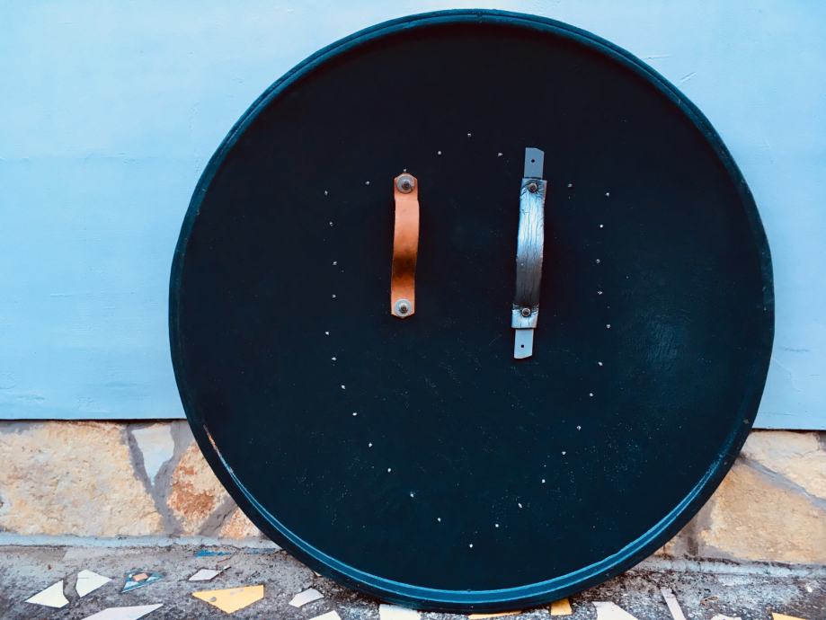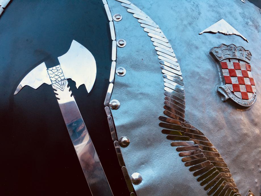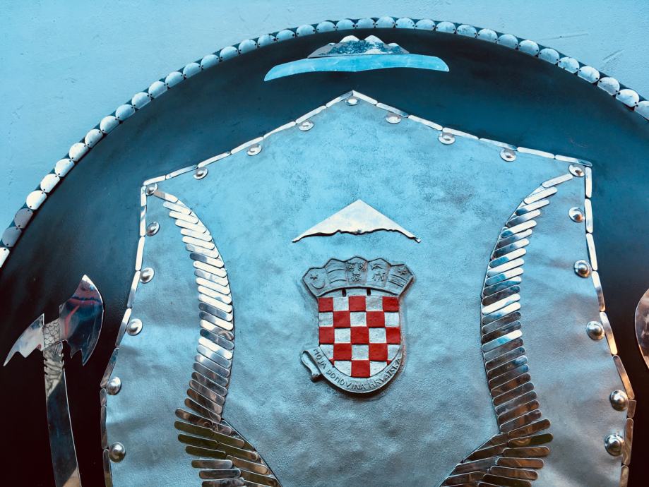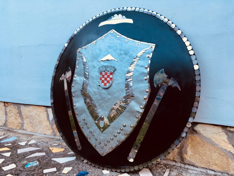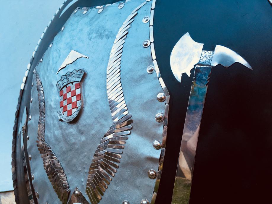 Hrvatski Štit velikih dimenzija od Inox Nehtđajućeg čelika sa grbom,sokolovima krilima i Helebardama,na poleđini rukohvat za držanje Štita. Dimenzije Štita su promjera 94cm čvrst i masivan,stanje novo,izrađen tehnikom kovanja u savršenom stanju. Ne šaljem poštom,preuzimanje osobno,cijena 205.Eura. Mogućnost dostave na autocestu u Karlovcu - naplatne kućice u Karlovcu.