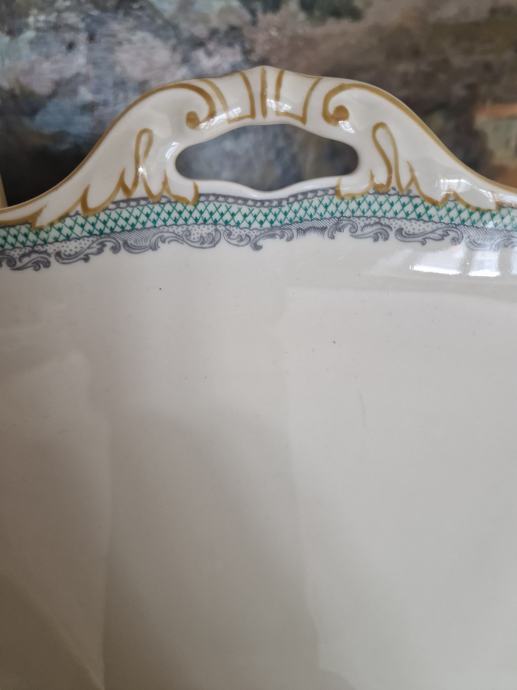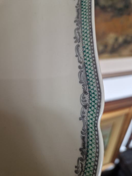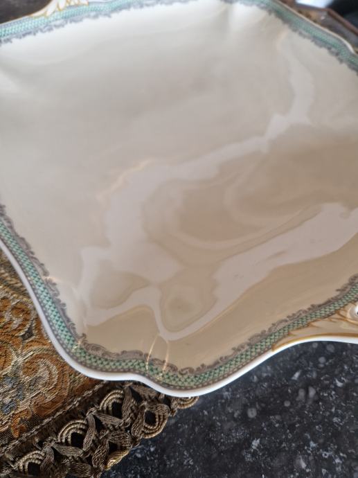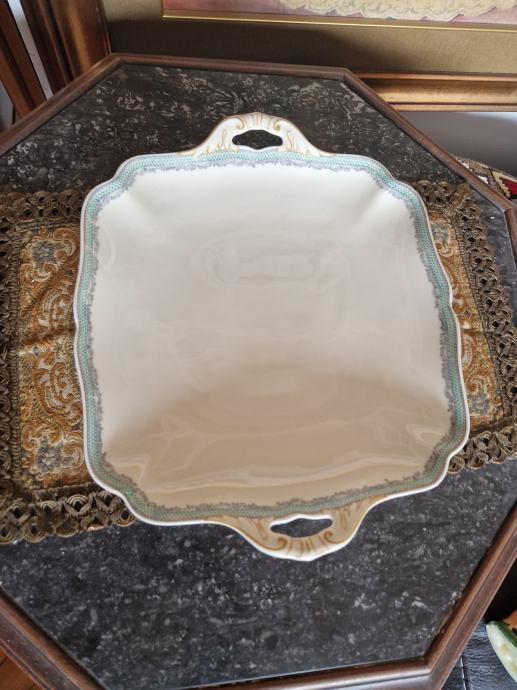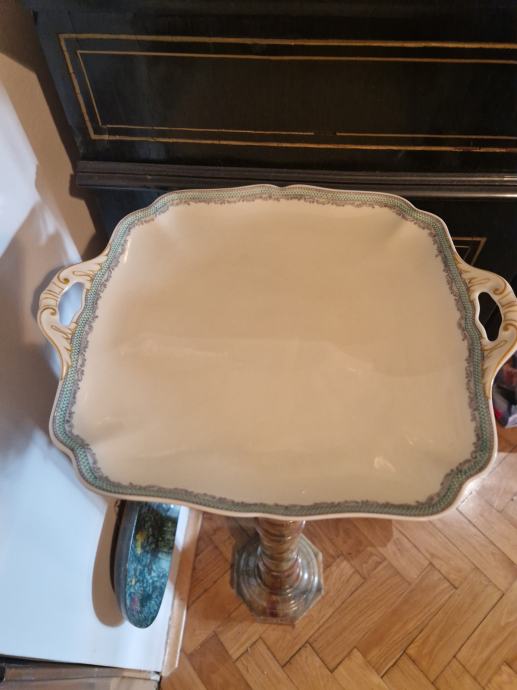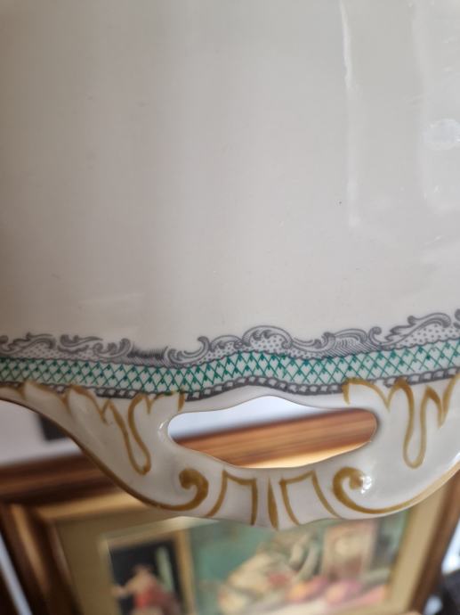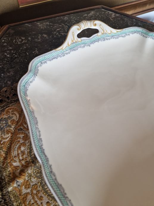 Brendirani njemački porculan, odlično stanje jer je pladanj stajao samo kao ukras, pozlata i elegantne gravure po rubovima super očuvane ( iz razloga jer je nekorišten), od ručke do ručke 32 cm. Cijena je fiksna :)