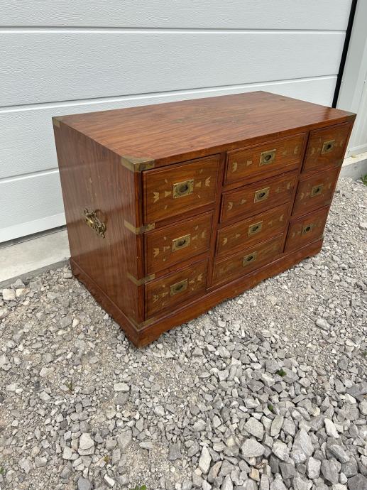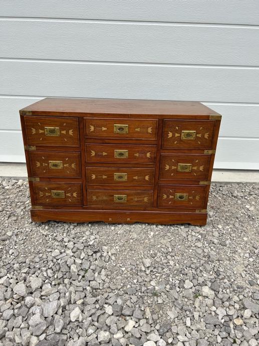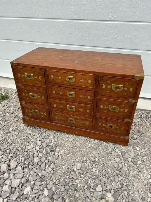 Krasna komoda, odlicnih dimenzija intarzirana mesingom. Komoda je u vrlo dobrom stanju.