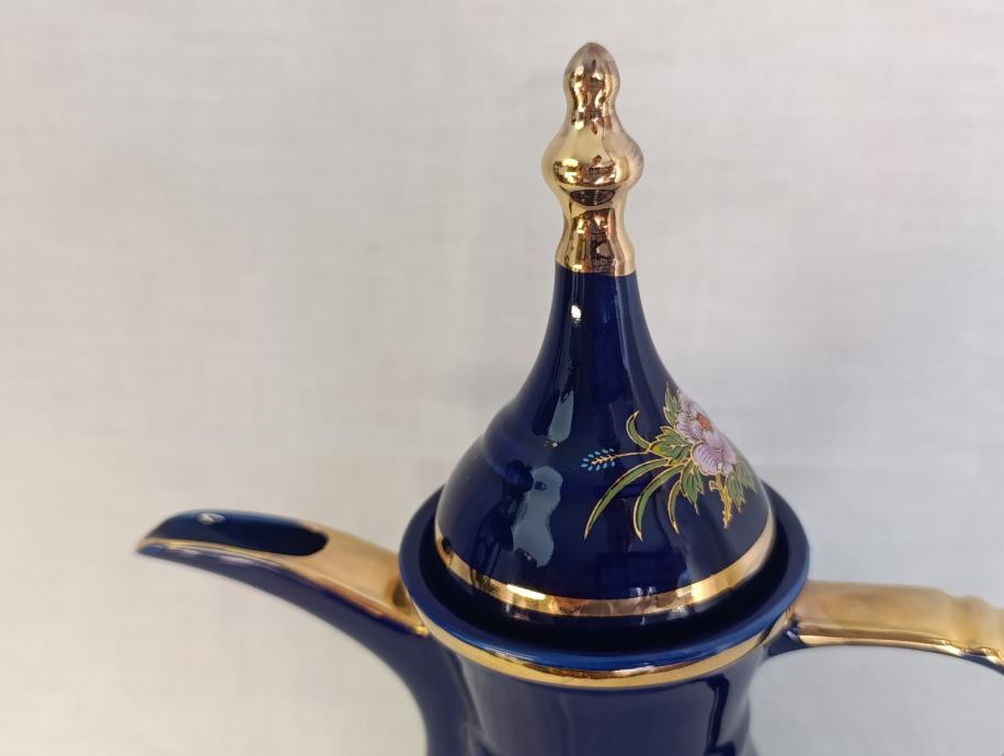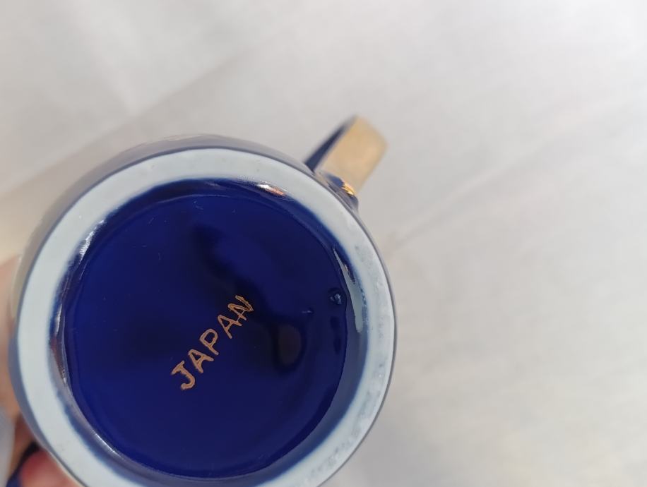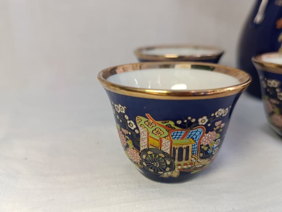 Vintage japanski porculanski set za sake u kobalt plavoj boji. Rijedak primjerak iz 1970- ih sa japanskim tradicionalnim motivima kočije i sakura cvijeća. Pozlata.