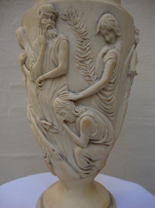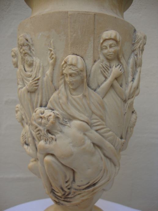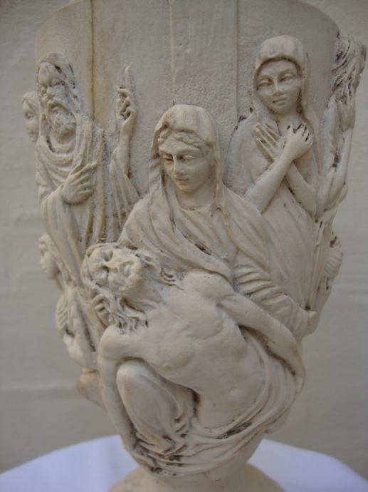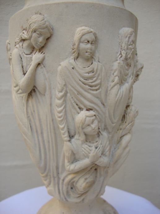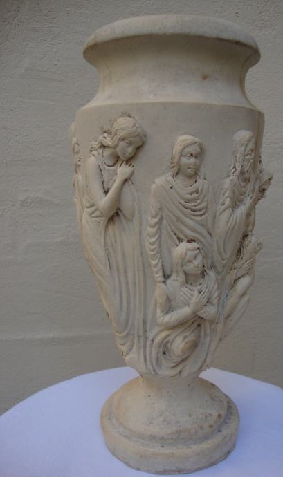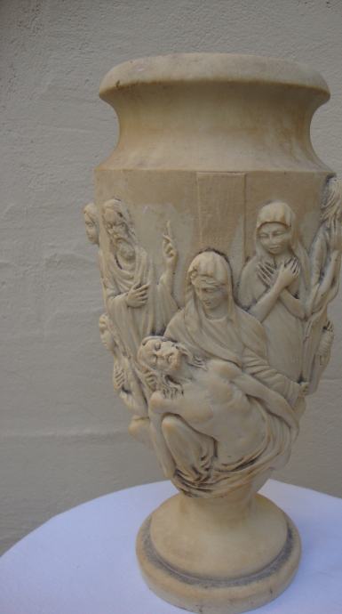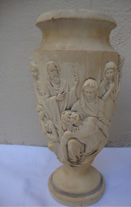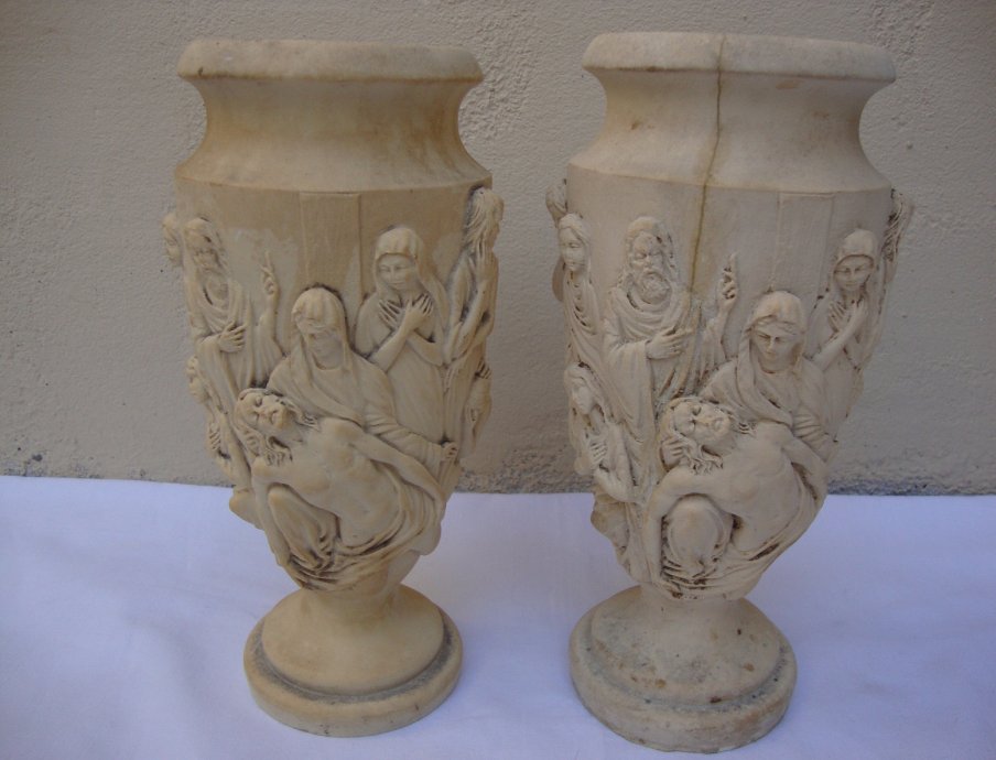STARE VAZE U PARU SA VJERSKIM MOTIVIMA ,NEKOĆ STAJALE POVIŠE KAMENOG KAMINA DOBROSTOJEĆE OBITELJI ----- SVAKA TEŽI 2 KG, ukupno 5 kg težine ,poželjno osobno preuzimanje - VISINE 25.5 cm mješavina kamena alabaster
