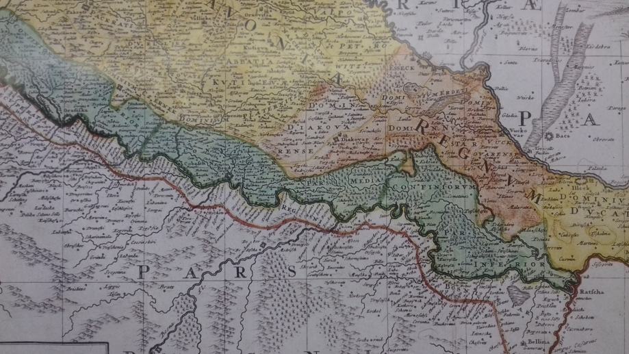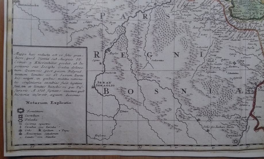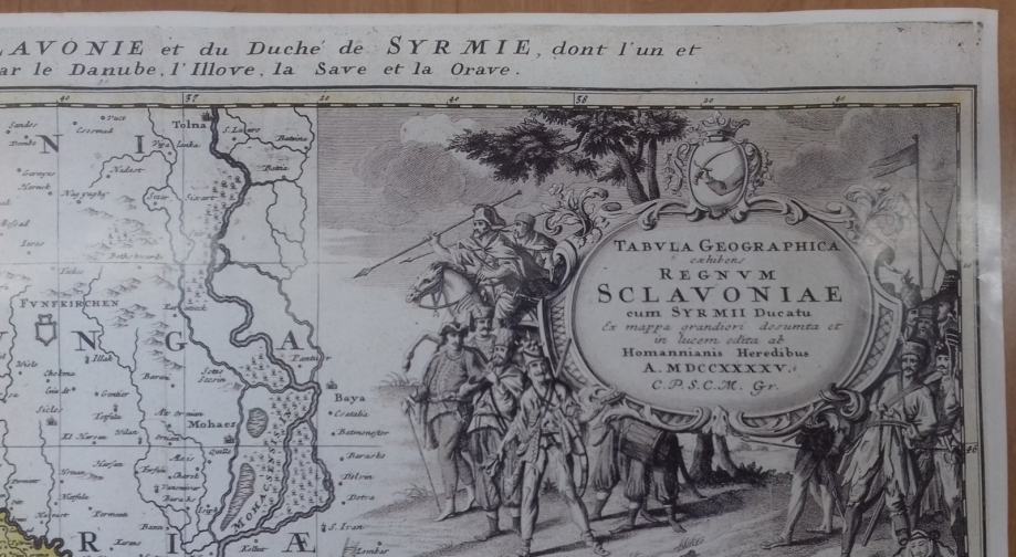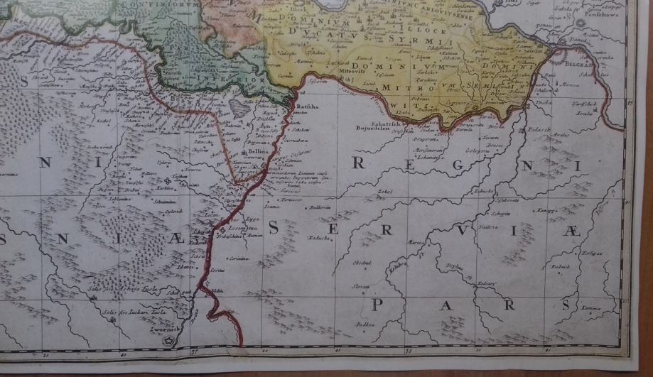Karta prikazuje Slavoniju i Srijem nakon mira u Požarevcu sklopljenog 1718.g. kojim je Srijem osloboðen od turske vlasti. Nastala je na temelju Khevenhullerove velike karte razgraničenja nakon Požarevačkog mira, te karte Slavonije iz 1718.g. koju je izradio Joseph Gadea. Osobito je zanimljiva jer prikazuje slavonske posjede osnovane nakon oslobođenja od Turaka. Zelenom bojom označen je slavonski dio Vojne krajine. Posebno je označen i uzak pojas južno od Save koji je Požarevačkim mirom pripojen Habsburškoj Monarhiji. U gornjem desnom uglu karte nalazi se raskošna kartuša uz koju se nalaze ucrtani barun Trenk sa svojim husarima. Iznad kartuše nalazi se grb Rame.